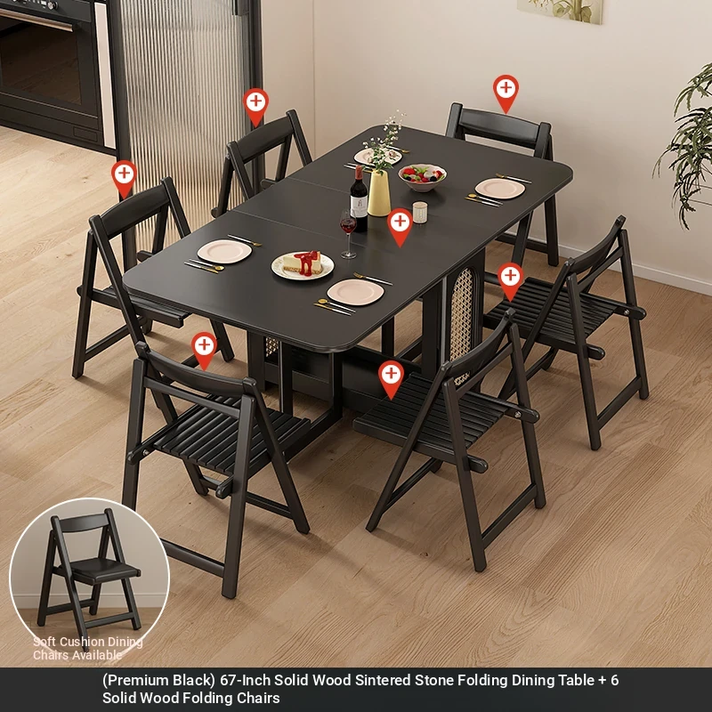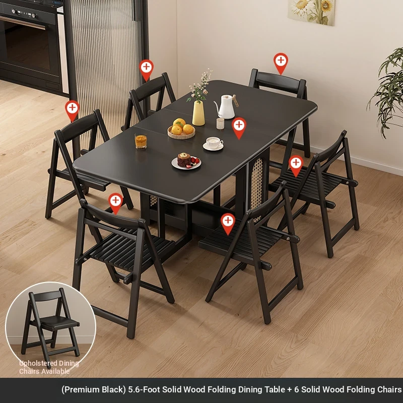 1.7メートル無垢材ロックプレート折りたたみダイニングテーブル【高級黒】+無垢材折りたたみチェア*6 抗菌ロックプレート