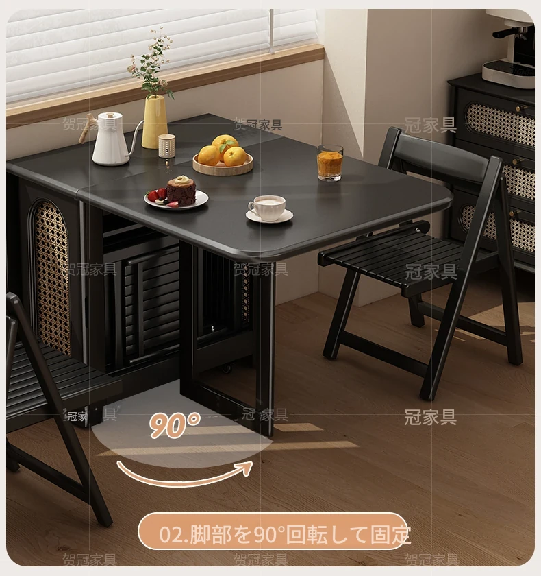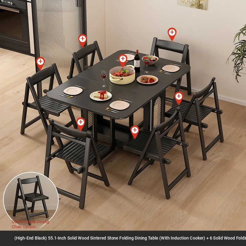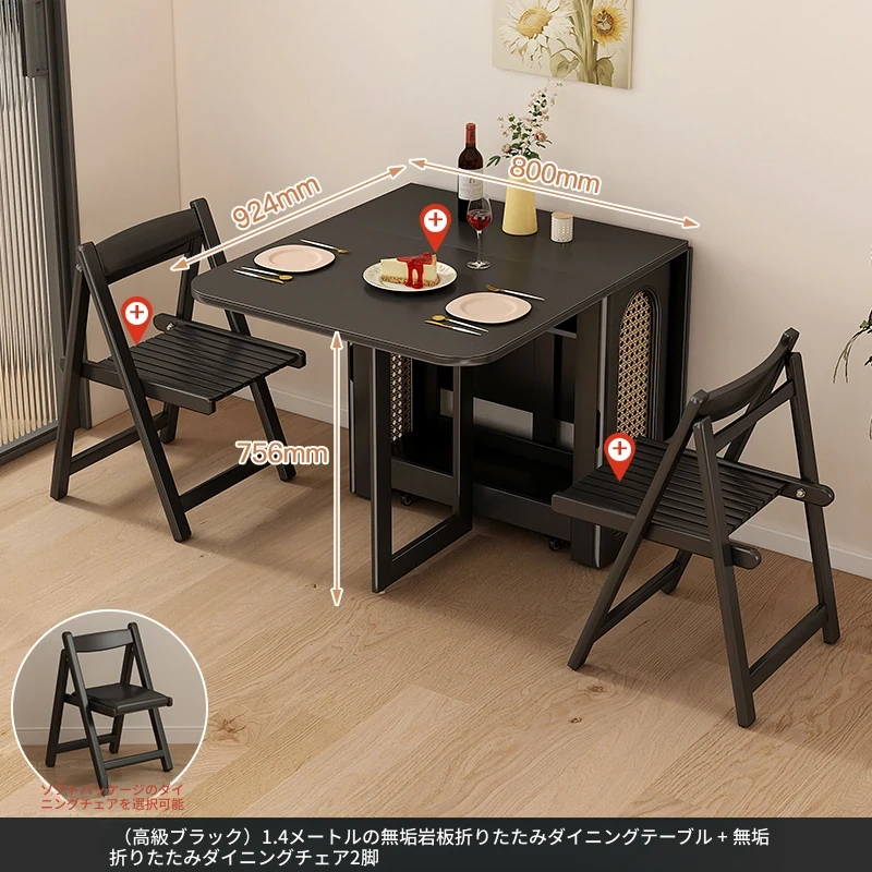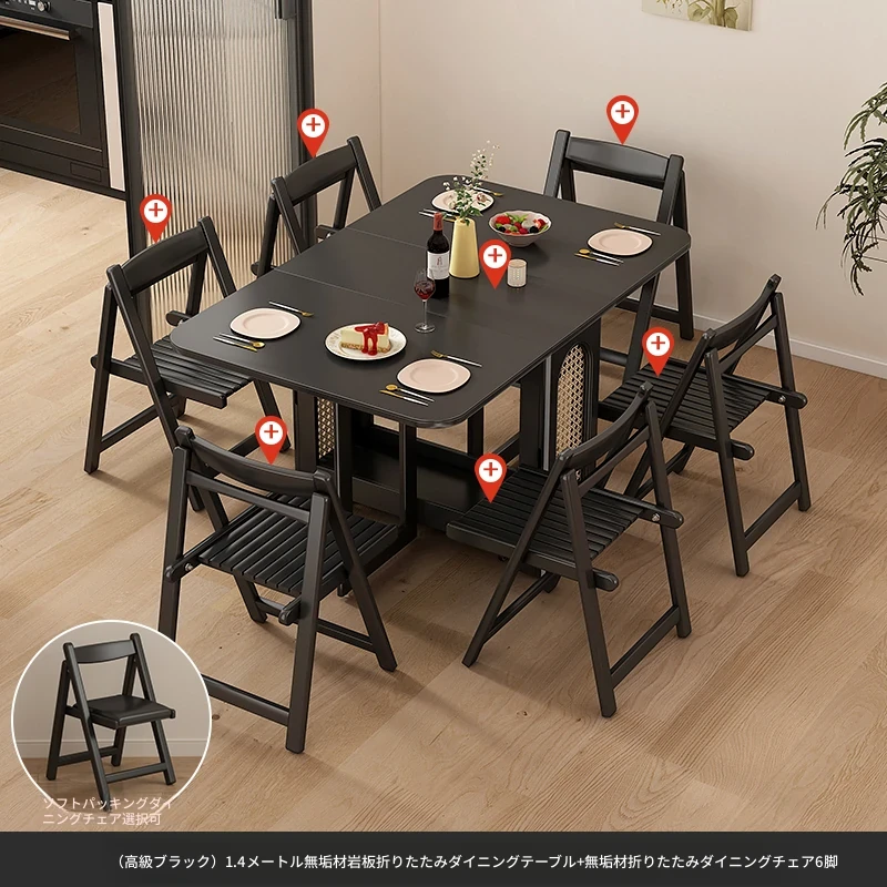 1.4メートル無垢材ロックプレート折りたたみダイニングテーブル【高級黒】+IHコンロ+無垢材折りたたみチェア*6 抗菌ロックプレート