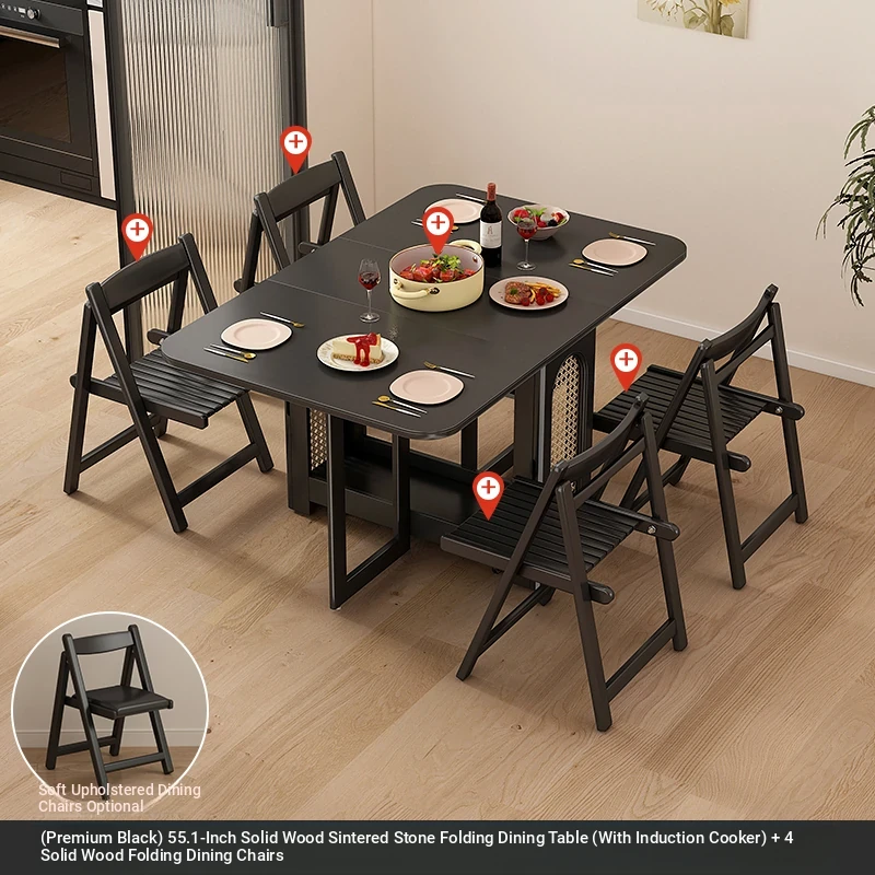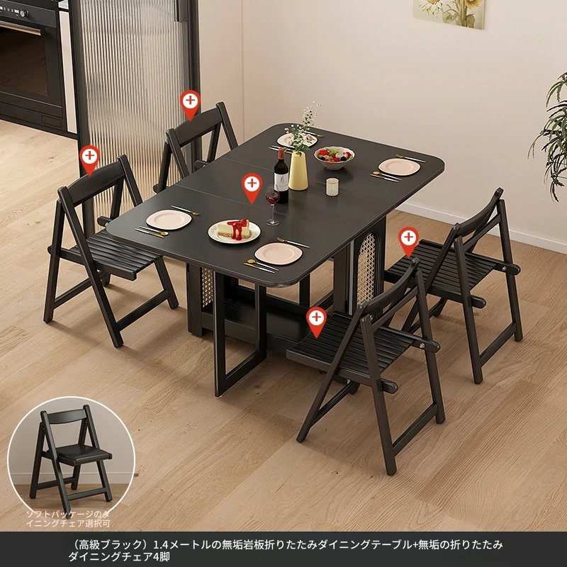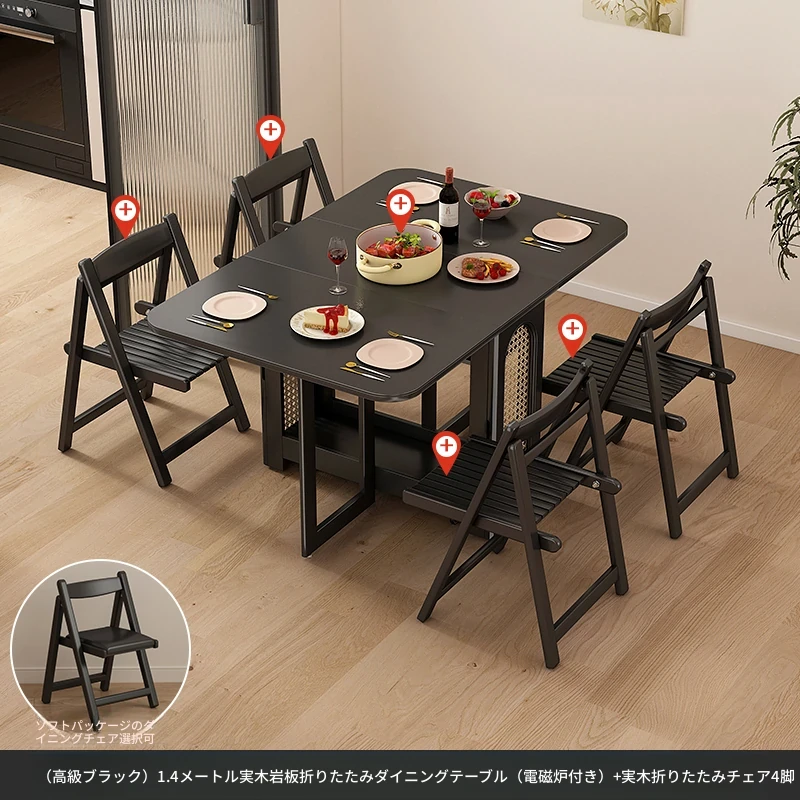 1.4メートル無垢材ロックプレート折りたたみダイニングテーブル【高級黒】+IHコンロ+無垢材折りたたみチェア*4 抗菌ロックプレート