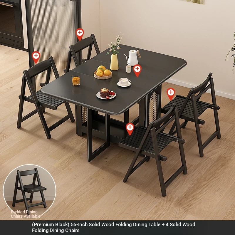 1.4メートル無垢材ロックプレート折りたたみダイニングテーブル【高級黒】+無垢材折りたたみチェア*4 抗菌ロックプレート