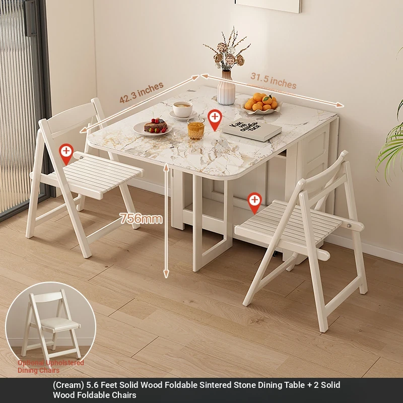 1.7メートル無垢材ロックプレート折りたたみダイニングテーブル【クリーム色】+無垢材折りたたみチェア*2 抗菌ロックプレート