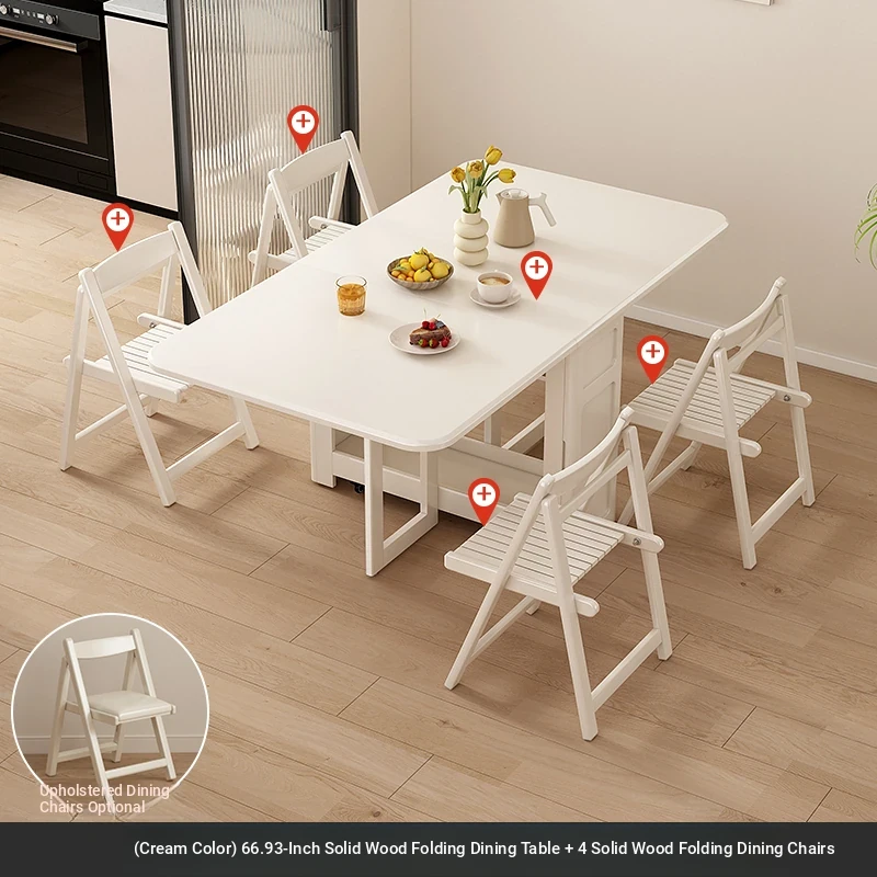 1.7メートル全無垢材折りたたみダイニングテーブル【クリーム色】+無垢材折りたたみチェア*4
