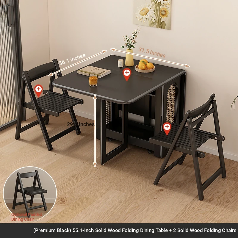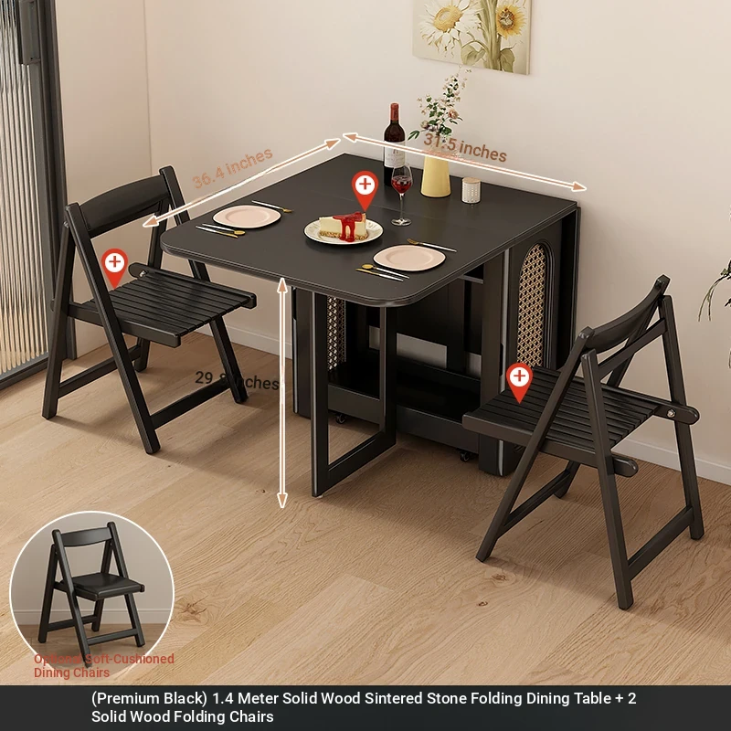1.4メートル無垢材ロックプレート折りたたみダイニングテーブル【高級黒】+無垢材折りたたみチェア*2 抗菌ロックプレート