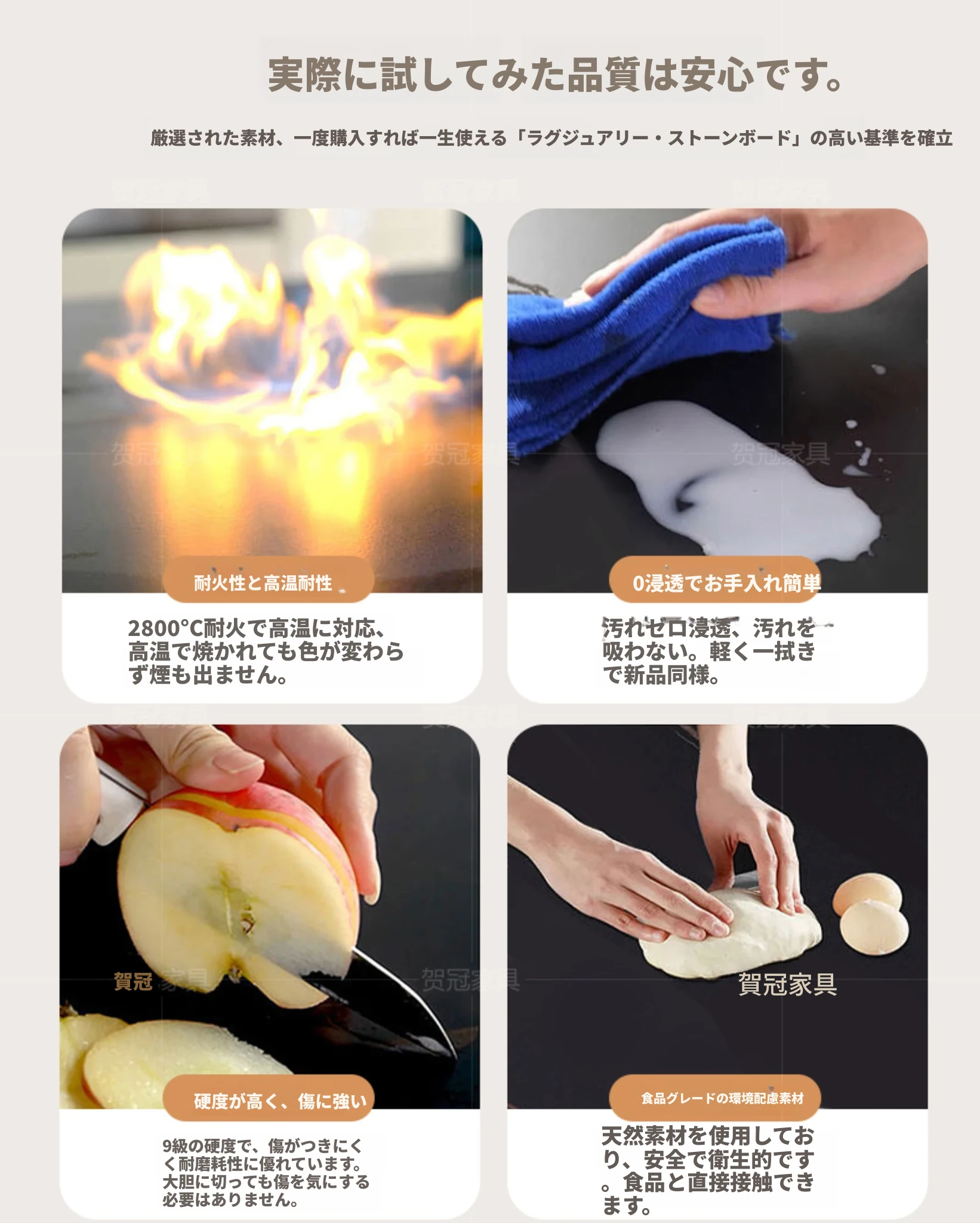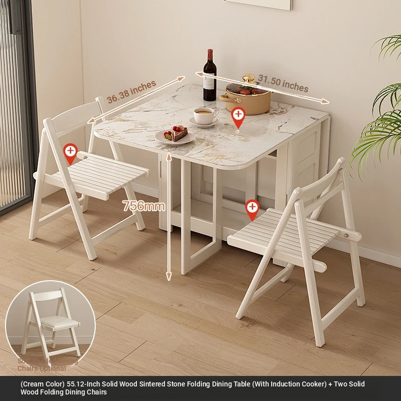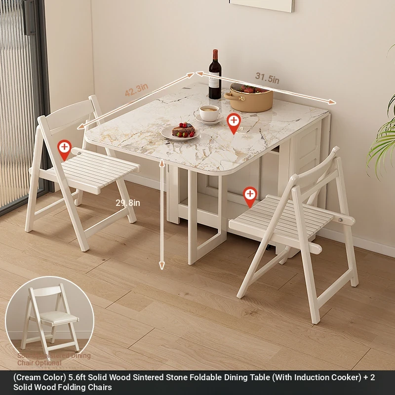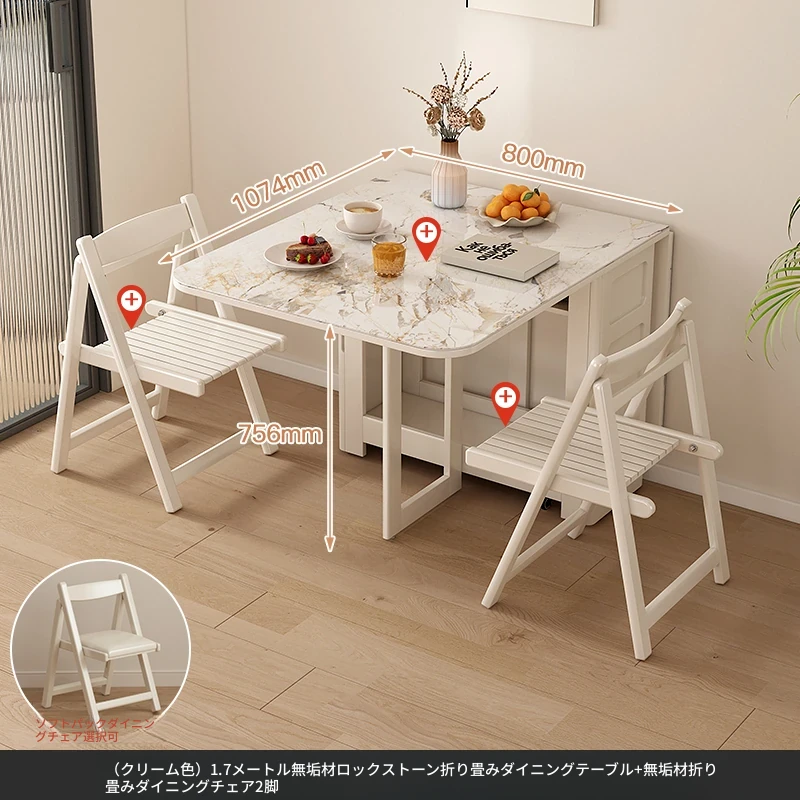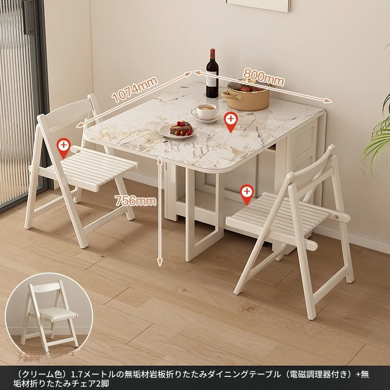 1.7メートル無垢材ロックプレート折りたたみダイニングテーブル【クリーム色】+IHコンロ+無垢材折りたたみチェア*2 抗菌ロックプレート