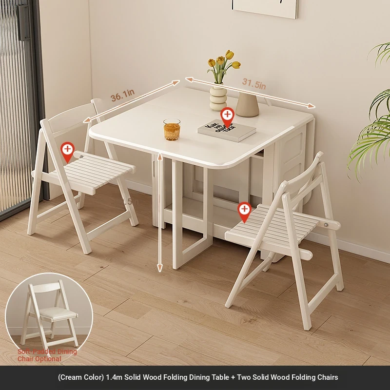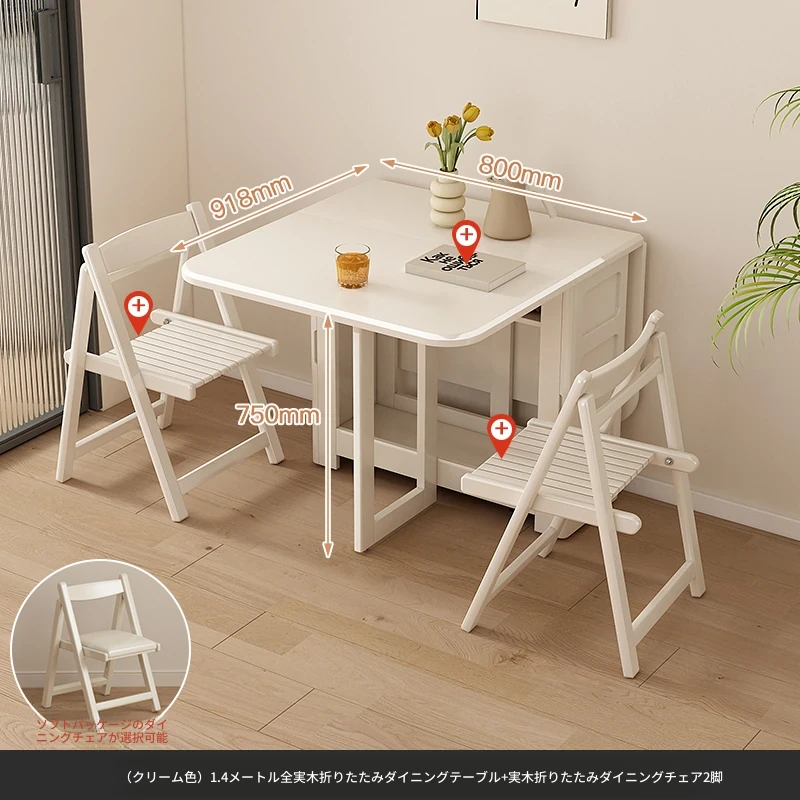 1.4メートル全無垢材折りたたみダイニングテーブル【クリーム色】+無垢材折りたたみチェア*2