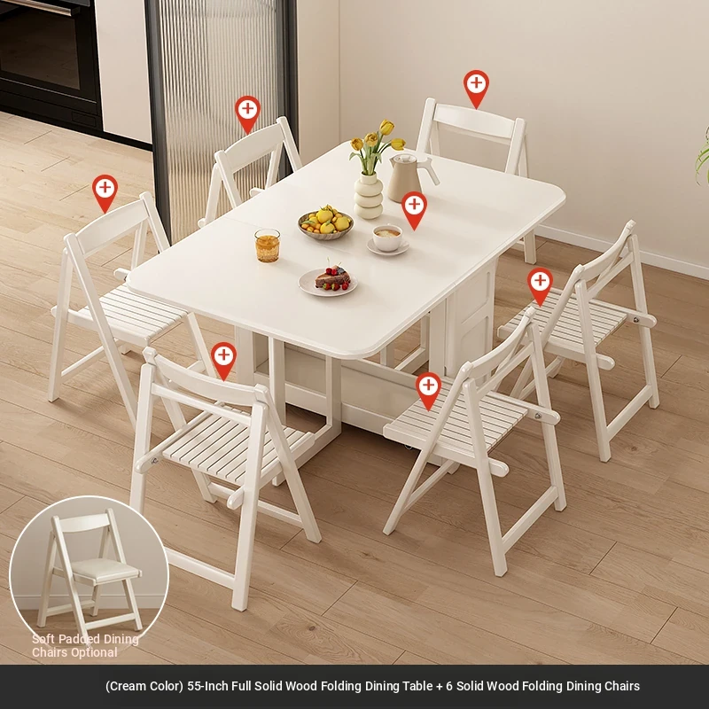 1.4メートル無垢材ロックプレート折りたたみダイニングテーブル【クリーム色】+無垢材折りたたみチェア*6 抗菌ロックプレート