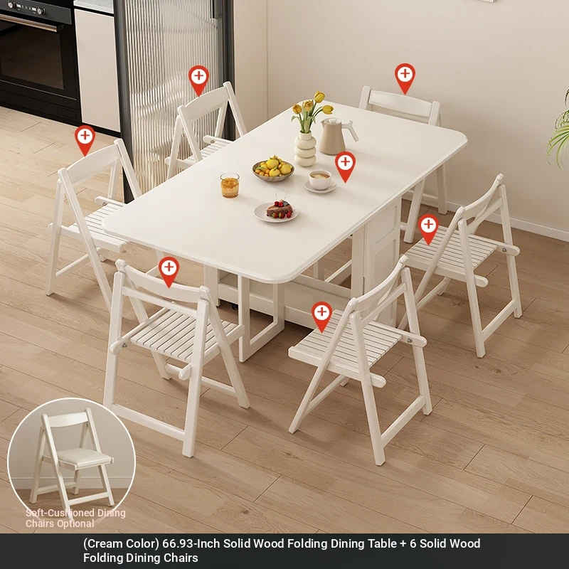 1.7メートル無垢材ロックプレート折りたたみダイニングテーブル【クリーム色】+無垢材折りたたみチェア*6 抗菌ロックプレート