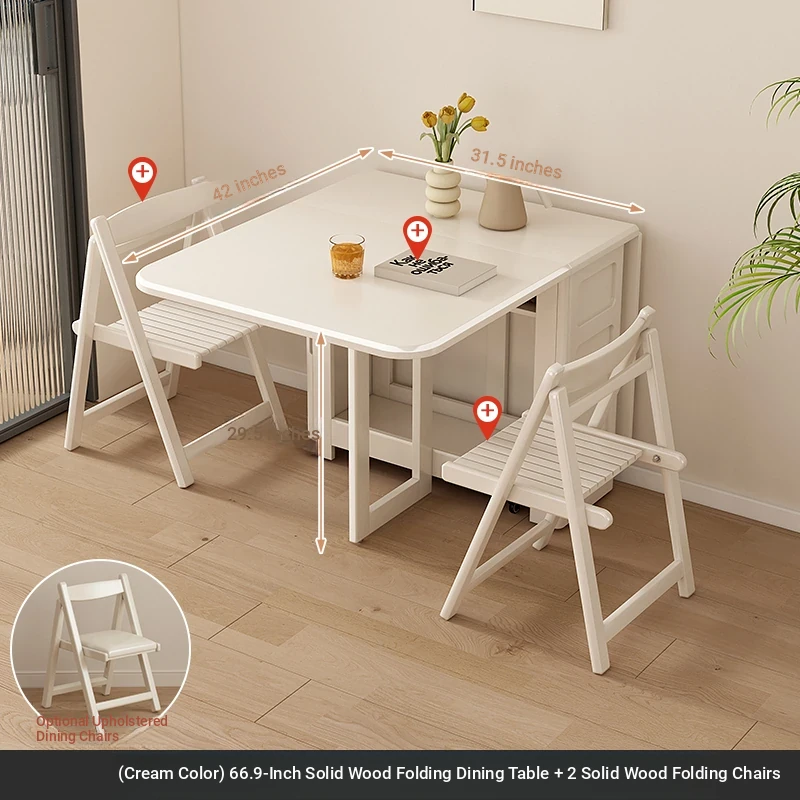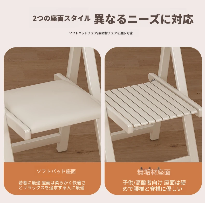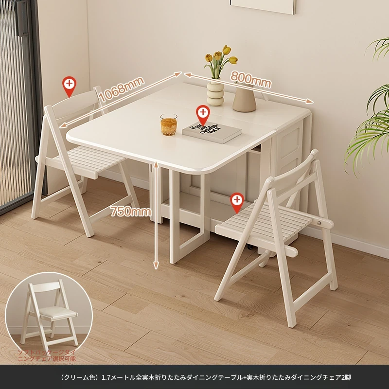 1.7メートル全無垢材折りたたみダイニングテーブル【クリーム色】+無垢材折りたたみチェア*2