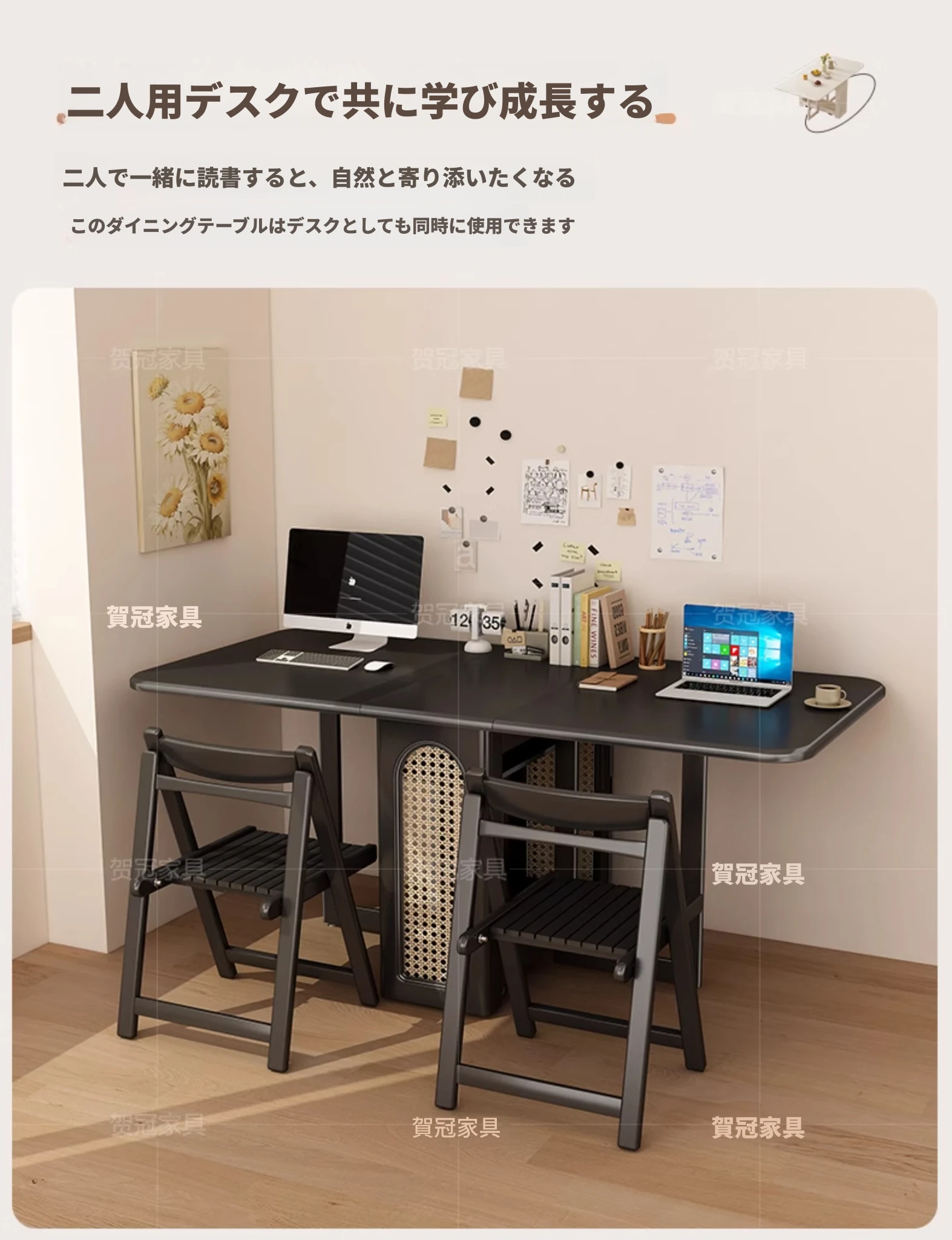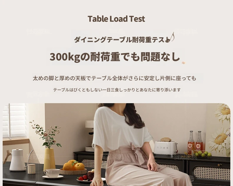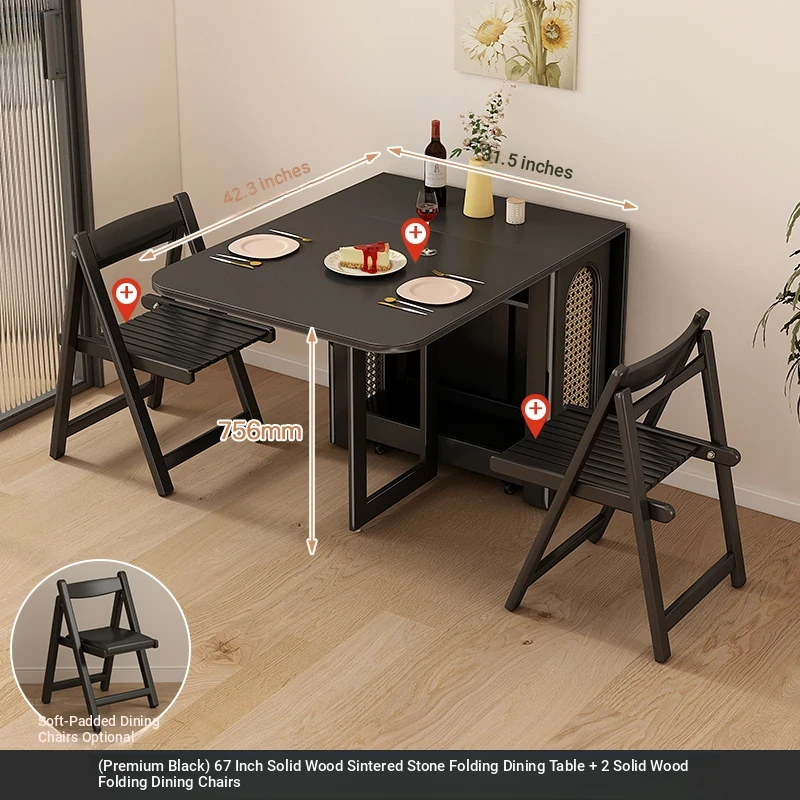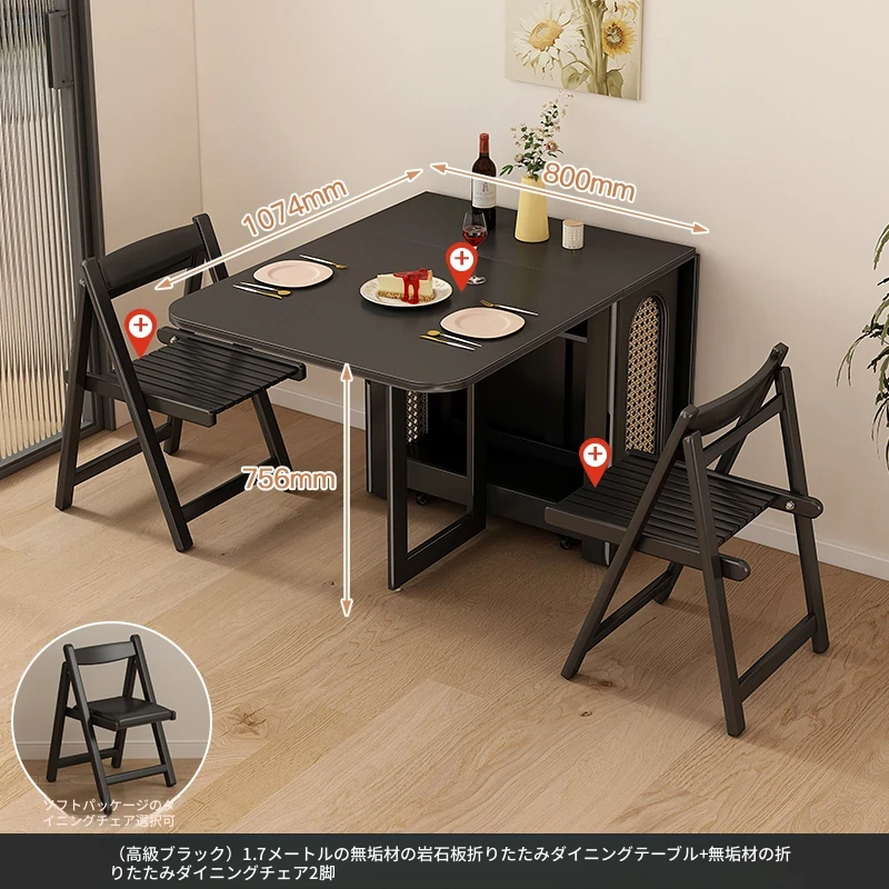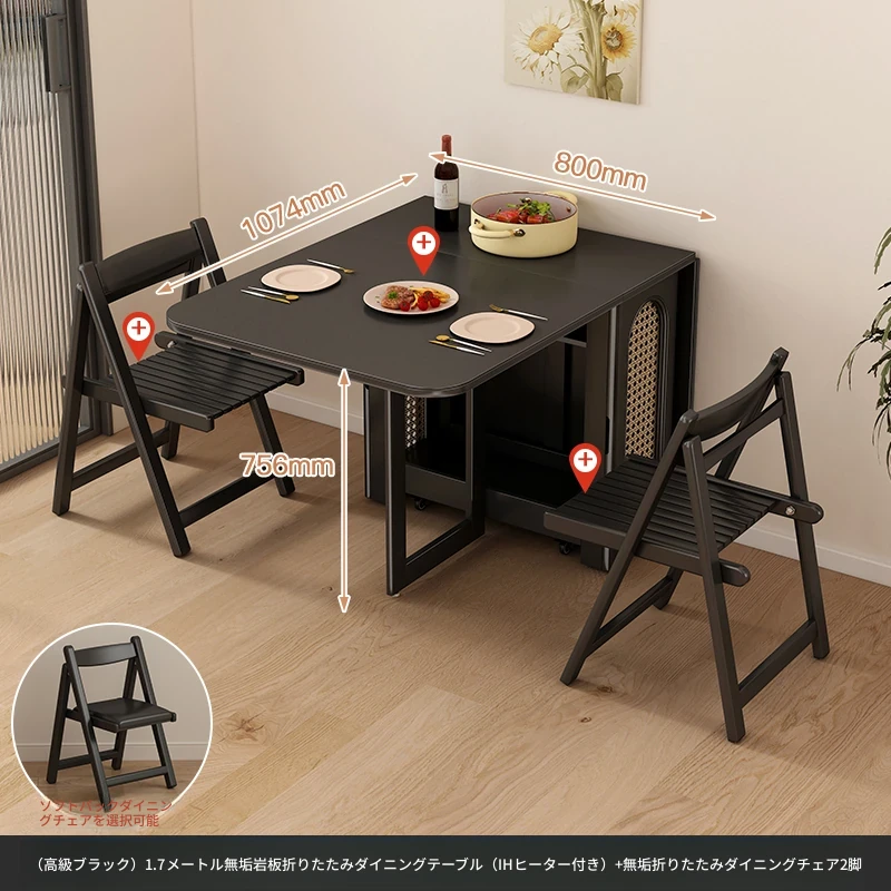 1.7メートル無垢材ロックプレート折りたたみダイニングテーブル【高級黒】+IHコンロ+無垢材折りたたみチェア*2 抗菌ロックプレート