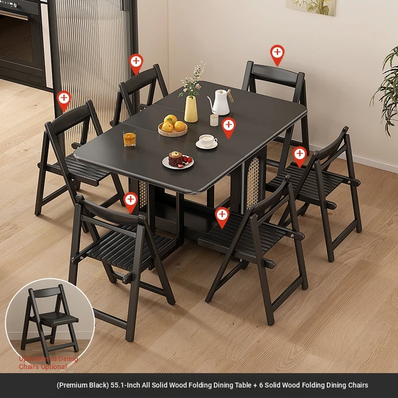 1.4メートル無垢材ロックプレート折りたたみダイニングテーブル【高級黒】+無垢材折りたたみチェア*6 抗菌ロックプレート
