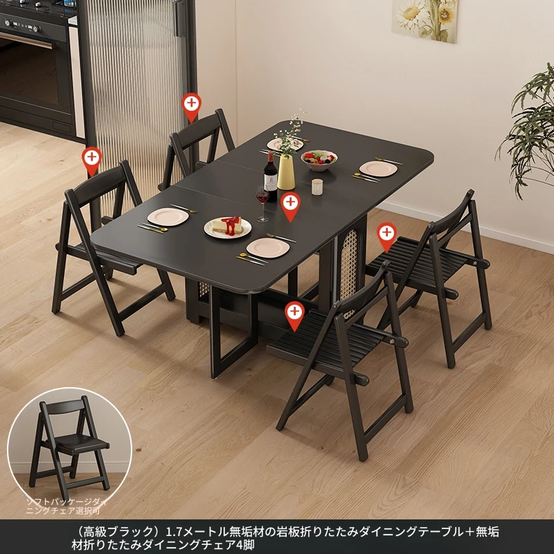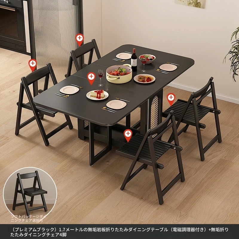 1.7メートル無垢材ロックプレート折りたたみダイニングテーブル【高級黒】+IHコンロ+無垢材折りたたみチェア*4 抗菌ロックプレート