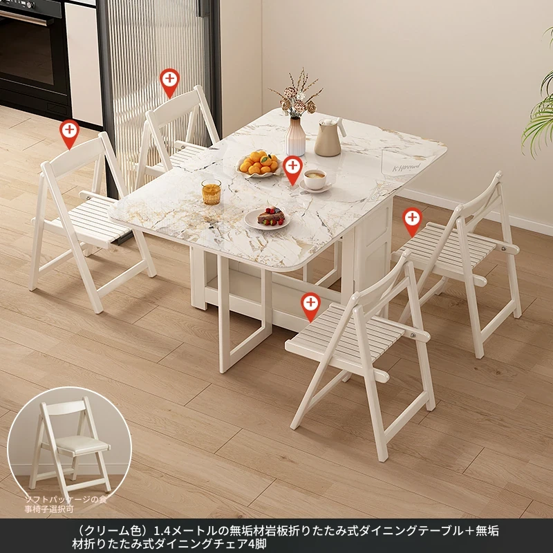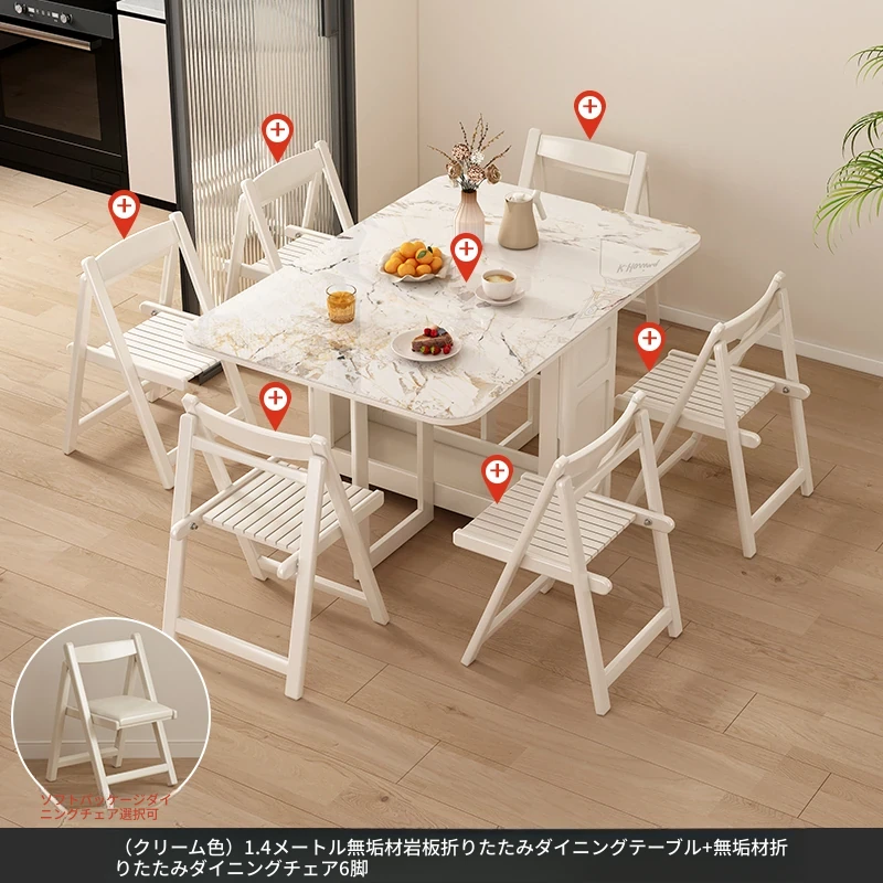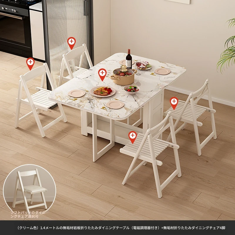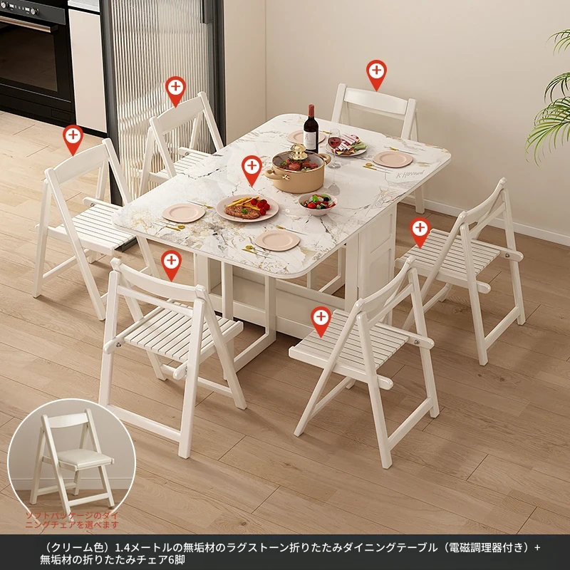 1.4メートル無垢材ロックプレート折りたたみダイニングテーブル【クリーム色】+IHコンロ+無垢材折りたたみチェア*6 抗菌ロックプレート