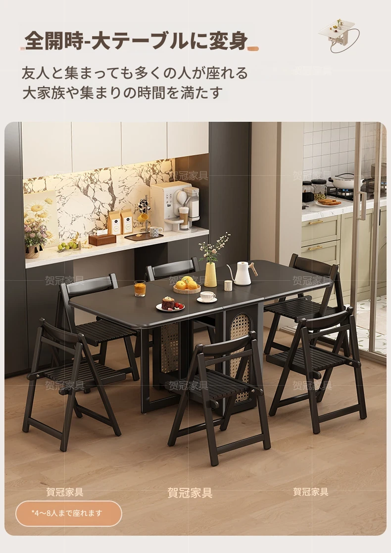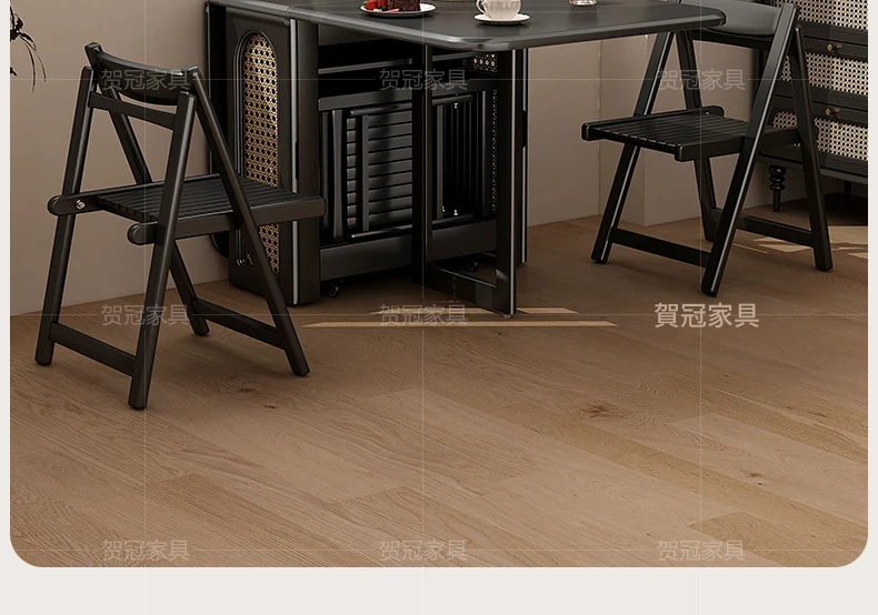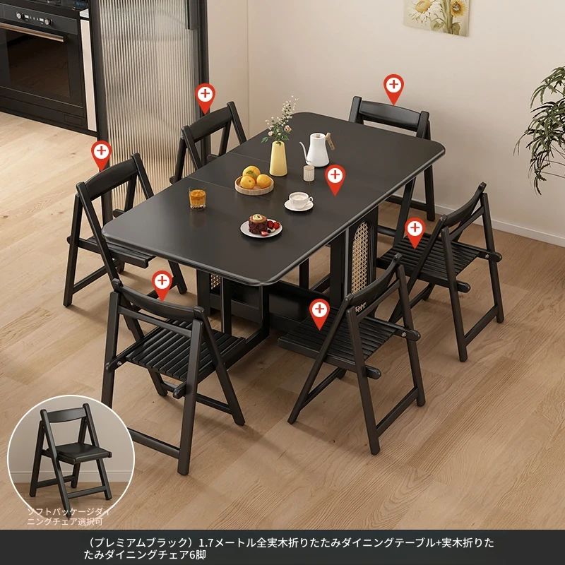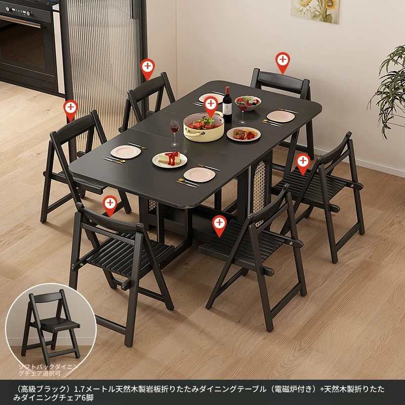 1.7メートル無垢材ロックプレート折りたたみダイニングテーブル【高級黒】+IHコンロ+無垢材折りたたみチェア*6 抗菌ロックプレート