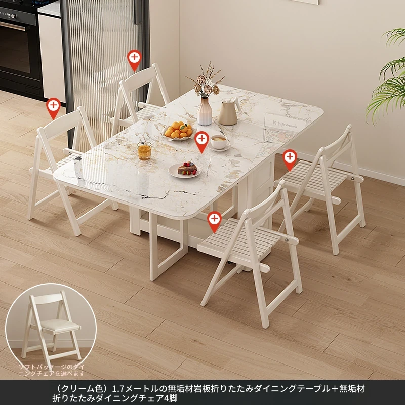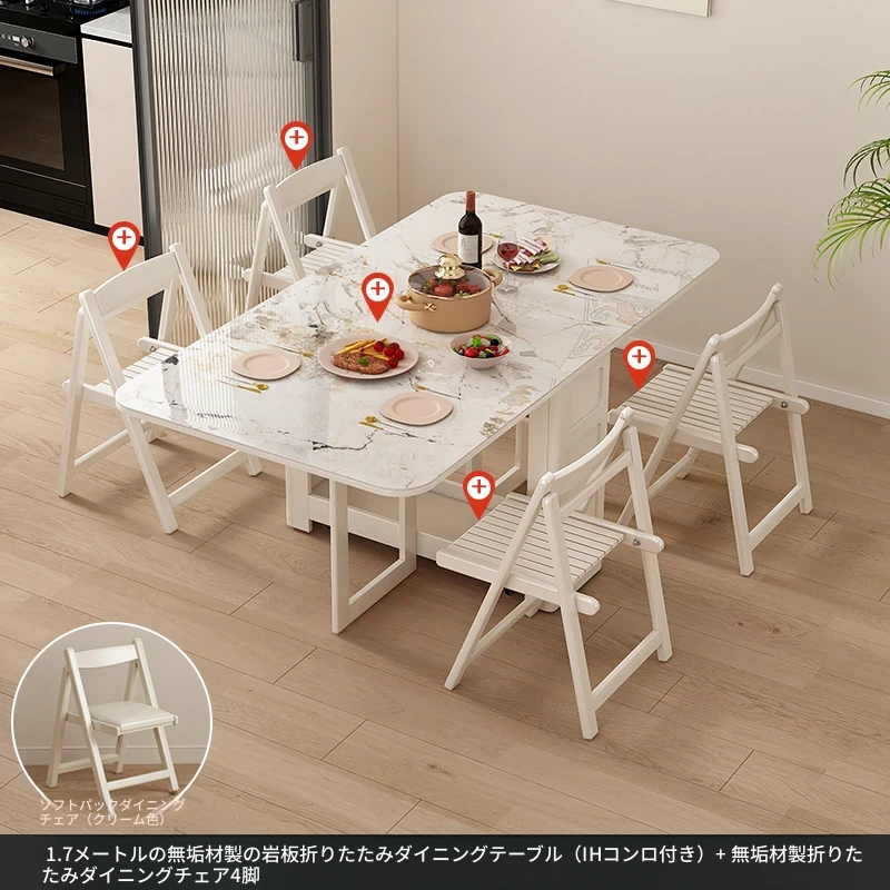 1.7メートル無垢材ロックプレート折りたたみダイニングテーブル【クリーム色】+IHコンロ+無垢材折りたたみチェア*4 抗菌ロックプレート