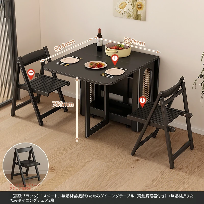1.4メートル無垢材ロックプレート折りたたみダイニングテーブル【高級黒】+IHコンロ+無垢材折りたたみチェア*2 抗菌ロックプレート