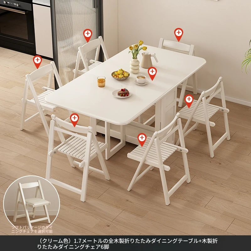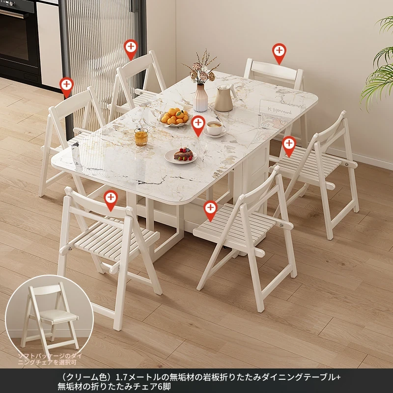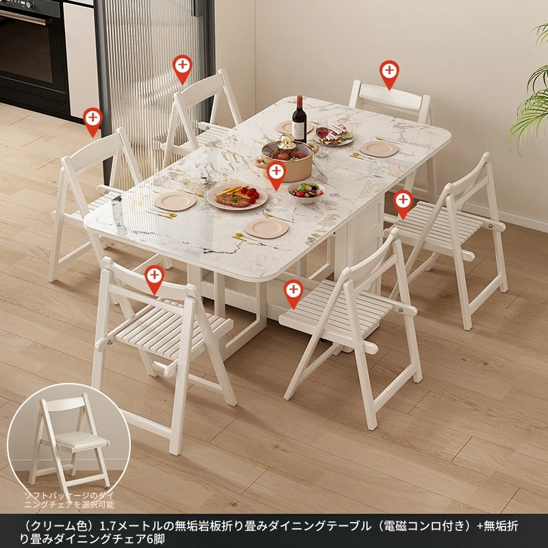 1.7メートル無垢材ロックプレート折りたたみダイニングテーブル【クリーム色】+IHコンロ+無垢材折りたたみチェア*6 抗菌ロックプレート