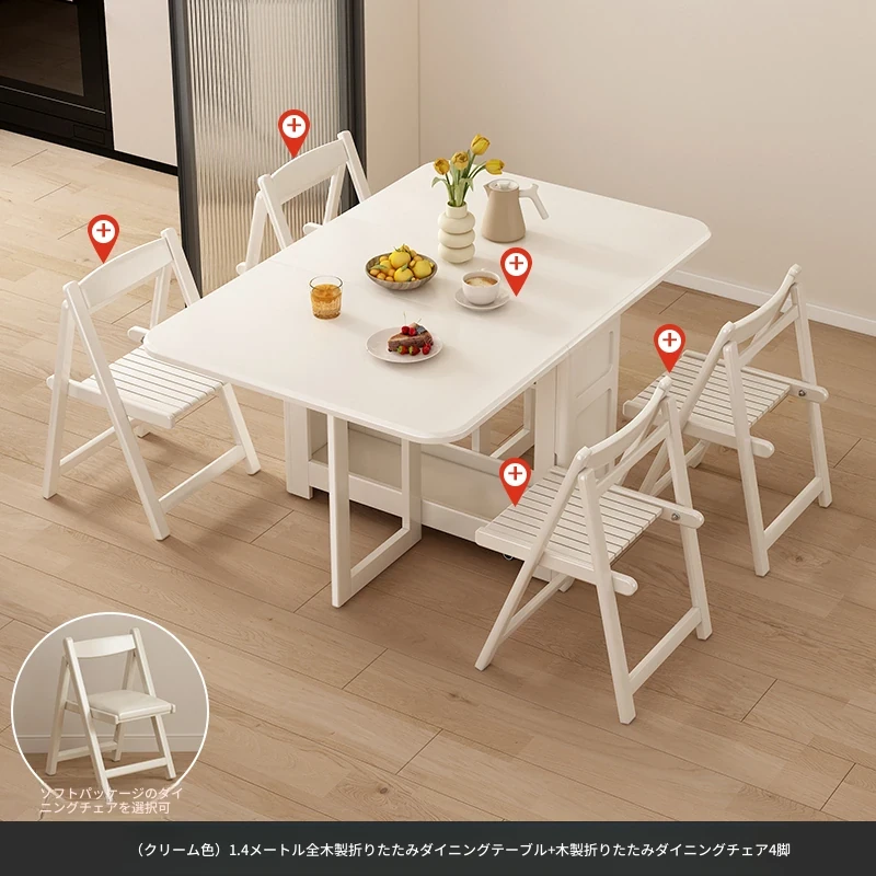1.4メートル全無垢材折りたたみダイニングテーブル【クリーム色】+無垢材折りたたみチェア*4