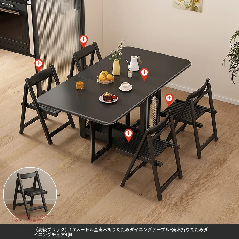 1.7メートル無垢材ロックプレート折りたたみダイニングテーブル【高級黒】+無垢材折りたたみチェア*4 抗菌ロックプレート