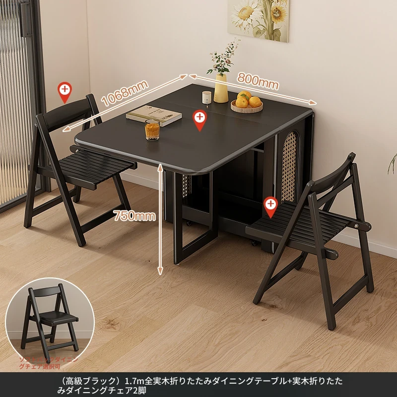 1.7メートル無垢材ロックプレート折りたたみダイニングテーブル【高級黒】+無垢材折りたたみチェア*2 抗菌ロックプレート