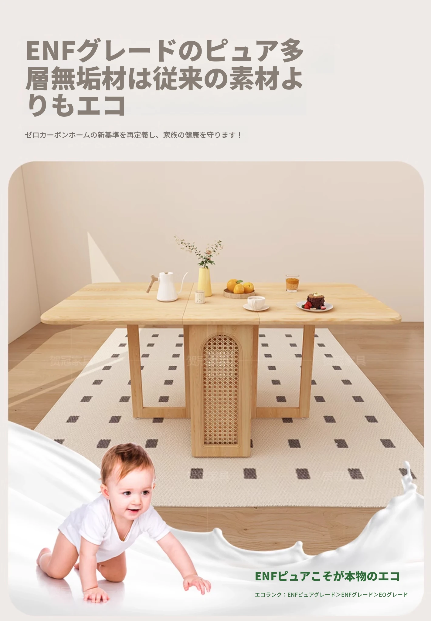 1.4メートル無垢材ロックプレート折りたたみダイニングテーブル【クリーム色】+IHコンロ 抗菌ロックプレート