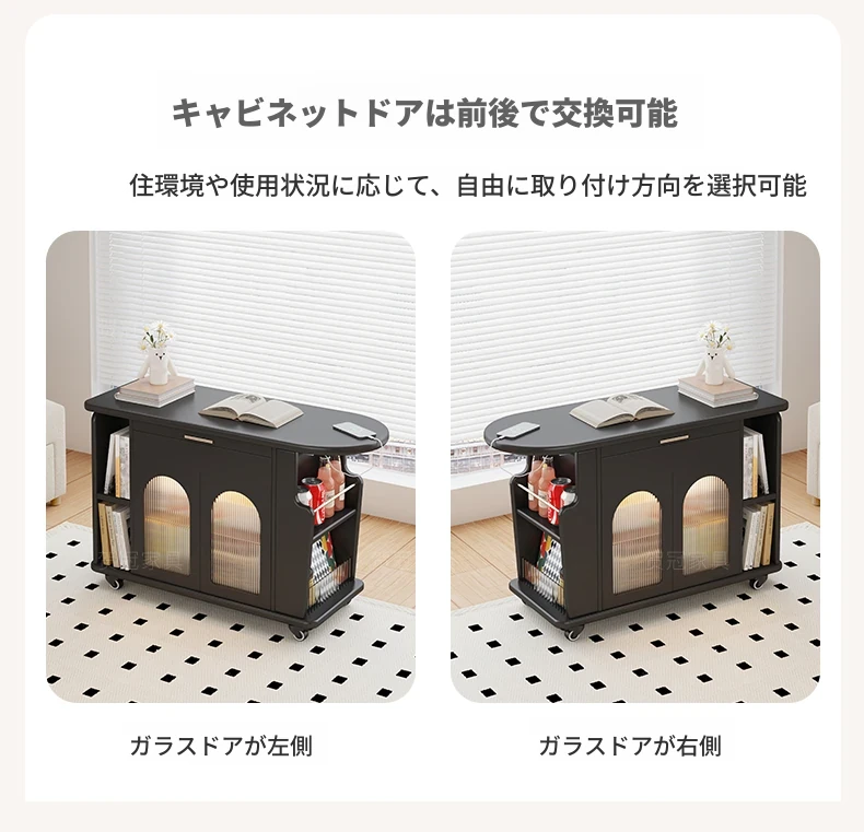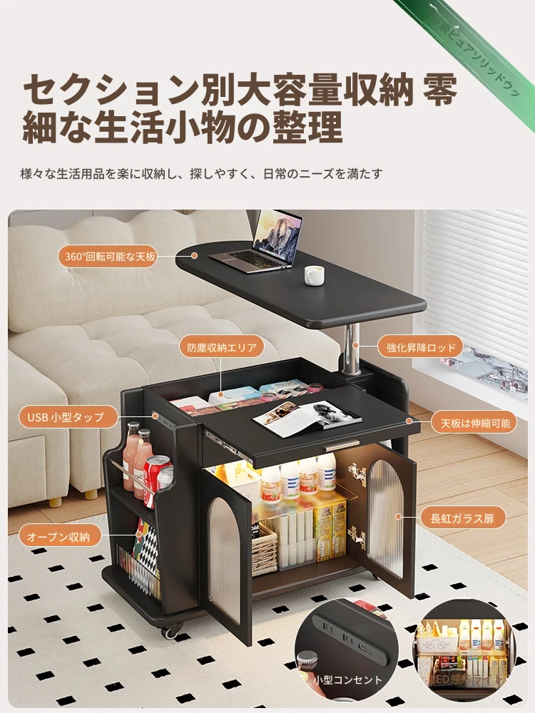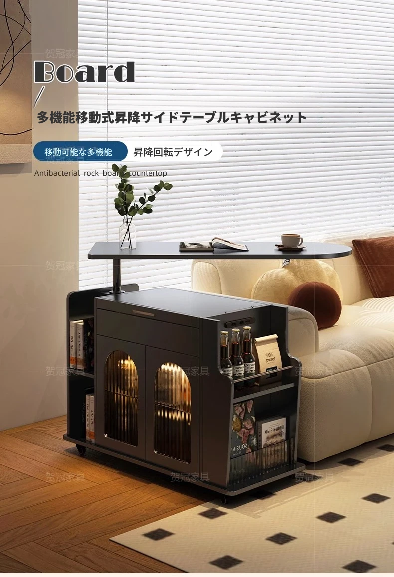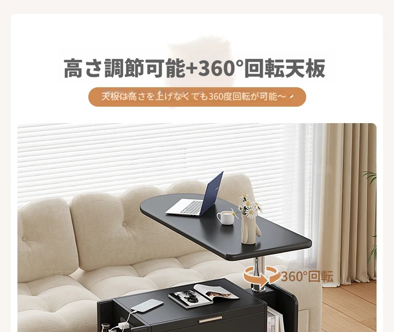 50cm多機能昇降サイドテーブル【ブラック抗菌エコボード+昇降回転テーブルトップ+キャスター+USB充電+LEDライト+指紋ロック】