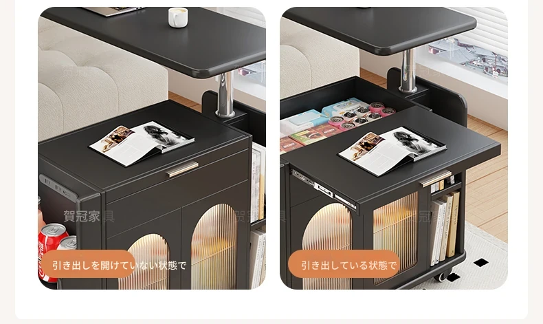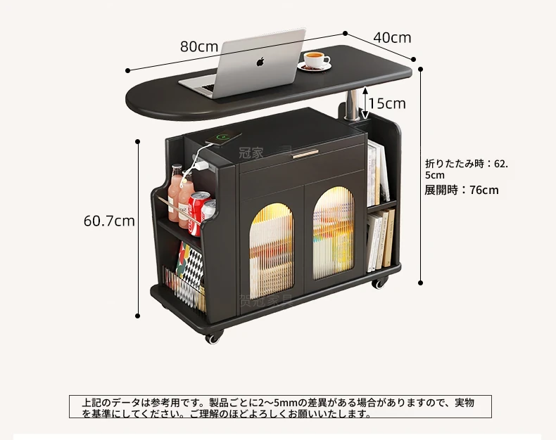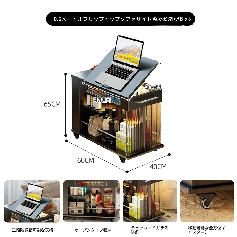 【レトロブラック】0.6メートル移動式フリップトップ昇降ベッドサイドテーブル