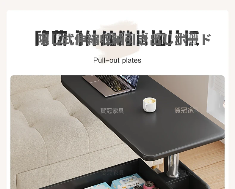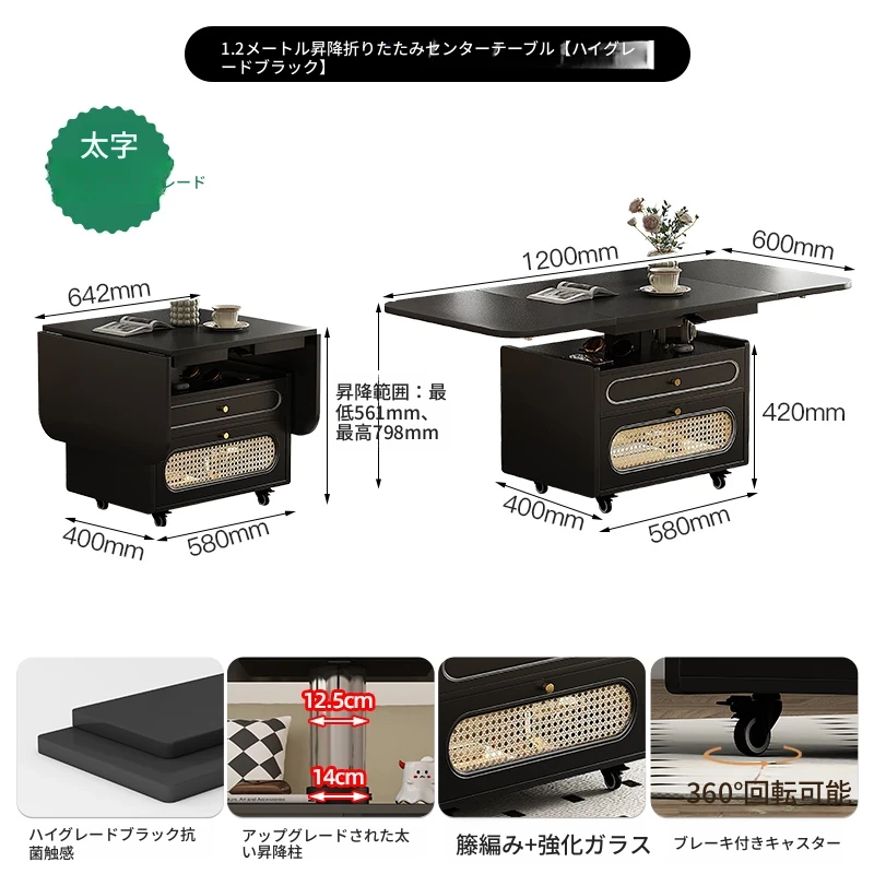 1.2メートル移動式昇降折りたたみコーヒーテーブルベッドサイドテーブル【プレミアムブラック】
