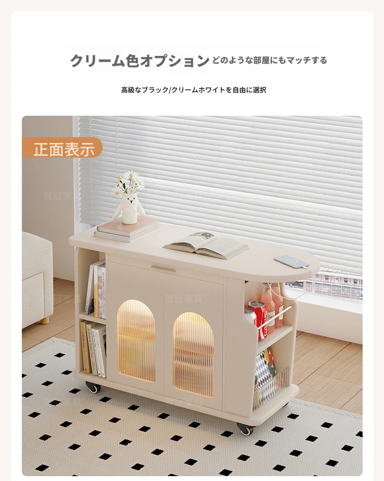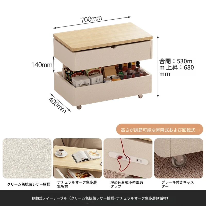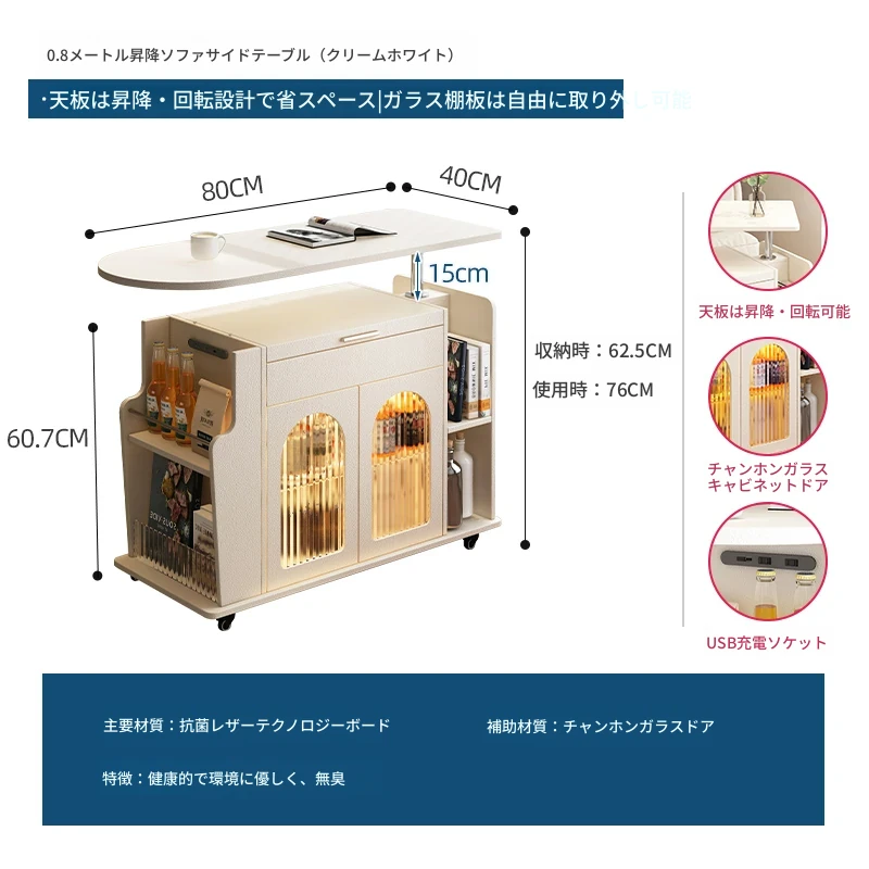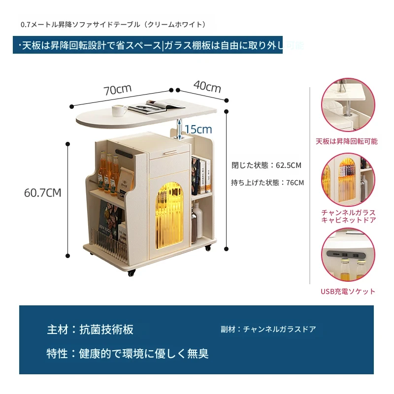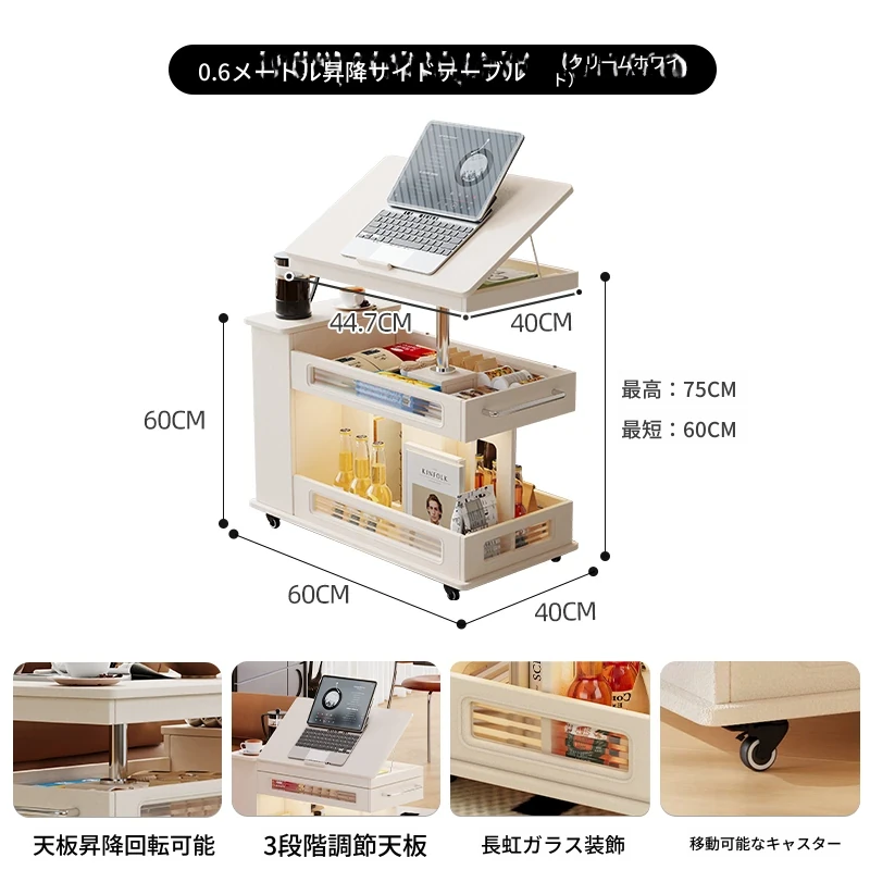 60cm多機能昇降サイドテーブル【クリームホワイトスキンテクスチャー+昇降回転テーブルトップ+キャスター+USB充電+LEDライト+指紋ロック】