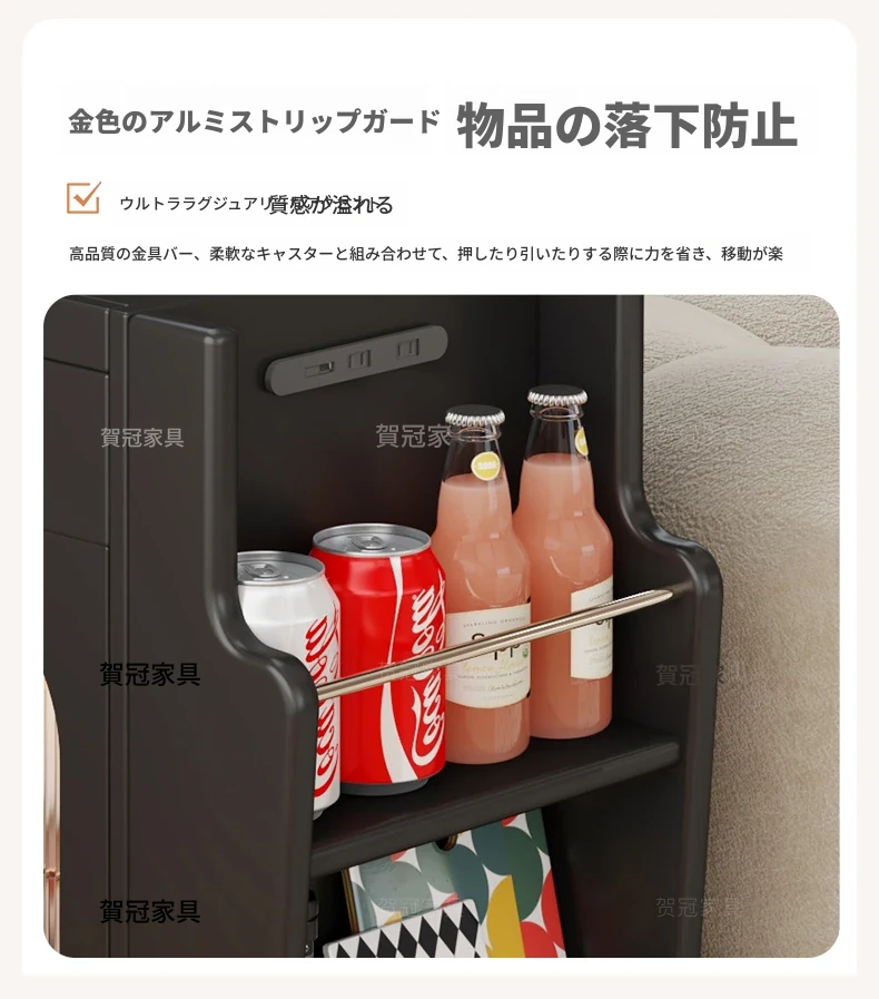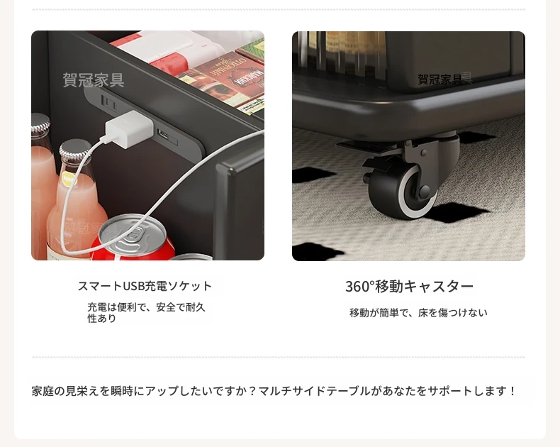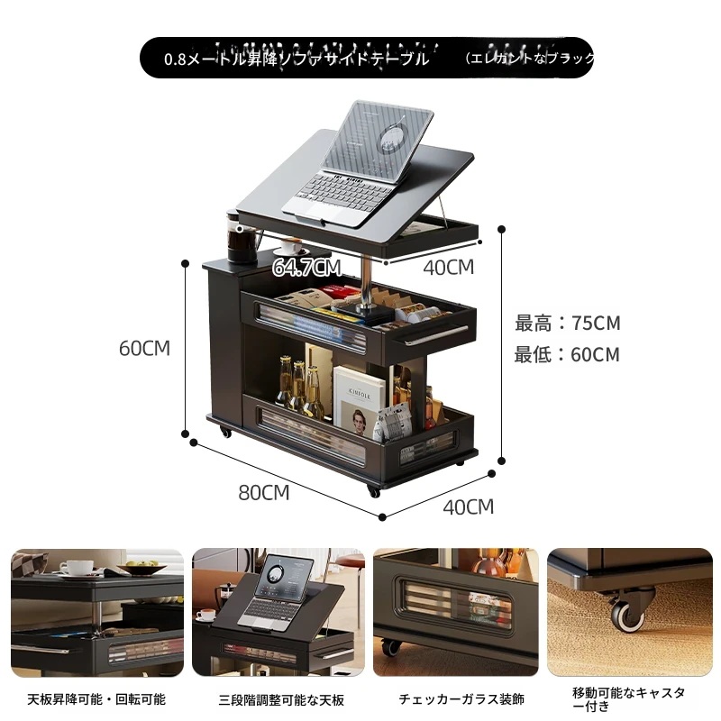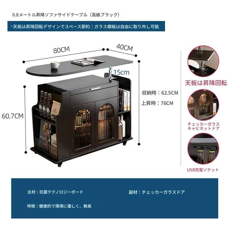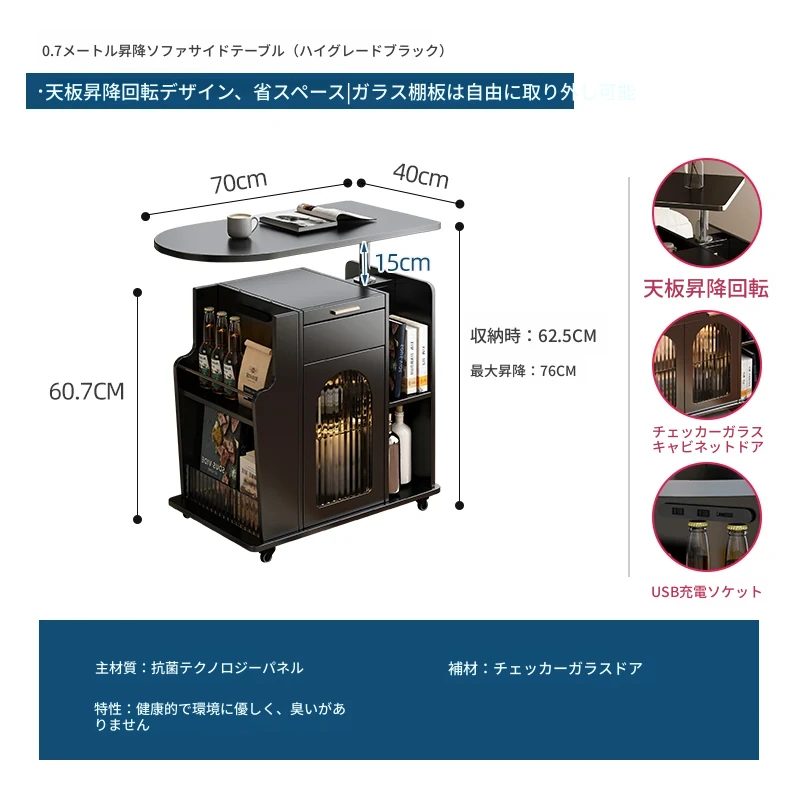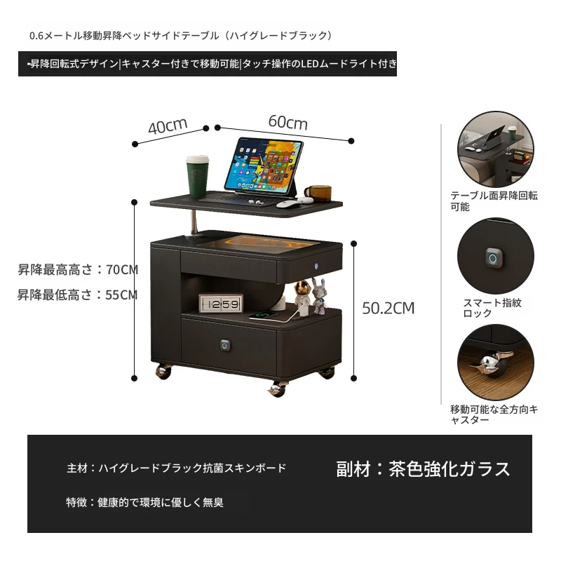 60cm多機能昇降サイドテーブル【ブラック抗菌エコボード+昇降回転テーブルトップ+キャスター+USB充電+LEDライト+指紋ロック】