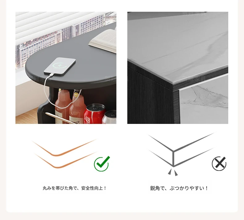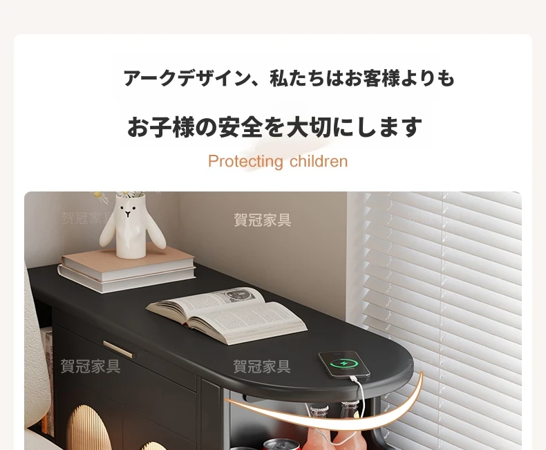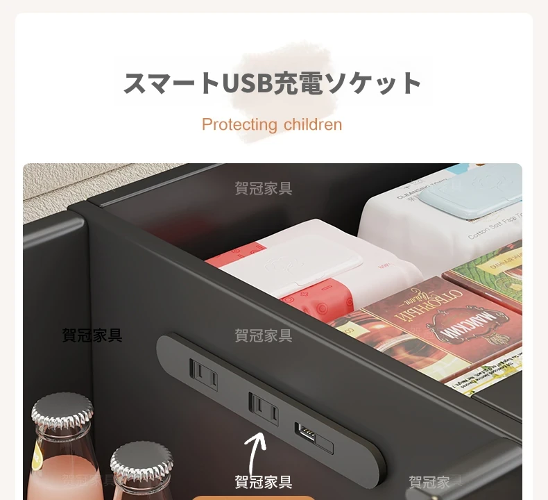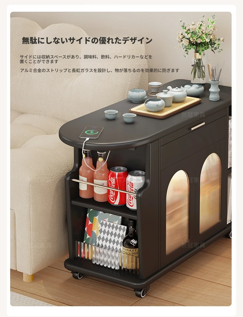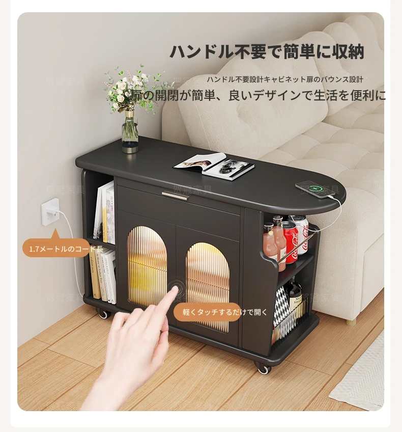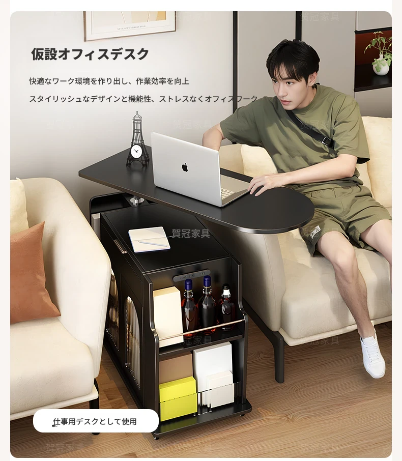 60cm多機能昇降サイドテーブル【ブラック抗菌エコボード+昇降回転テーブルトップ+キャスター+USB充電+LEDライト+指紋ロック】