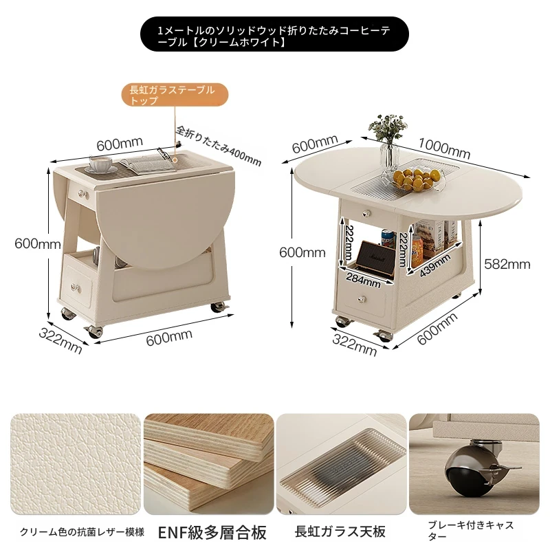 【クリームホワイト】0.6メートル移動式フリップトップベッドサイドテーブル