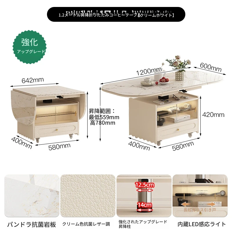 1.2メートル移動式昇降折りたたみコーヒーテーブルベッドサイドテーブル【プレミアムホワイト】