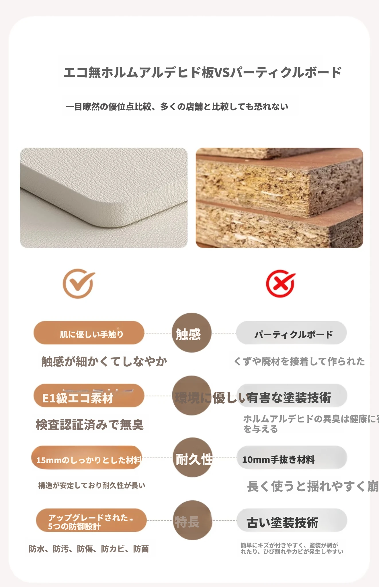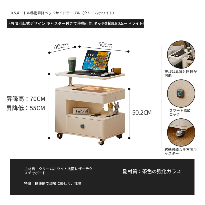 50cm多機能昇降サイドテーブル【クリームホワイトスキンテクスチャー+昇降回転テーブルトップ+キャスター+USB充電+LEDライト+指紋ロック】