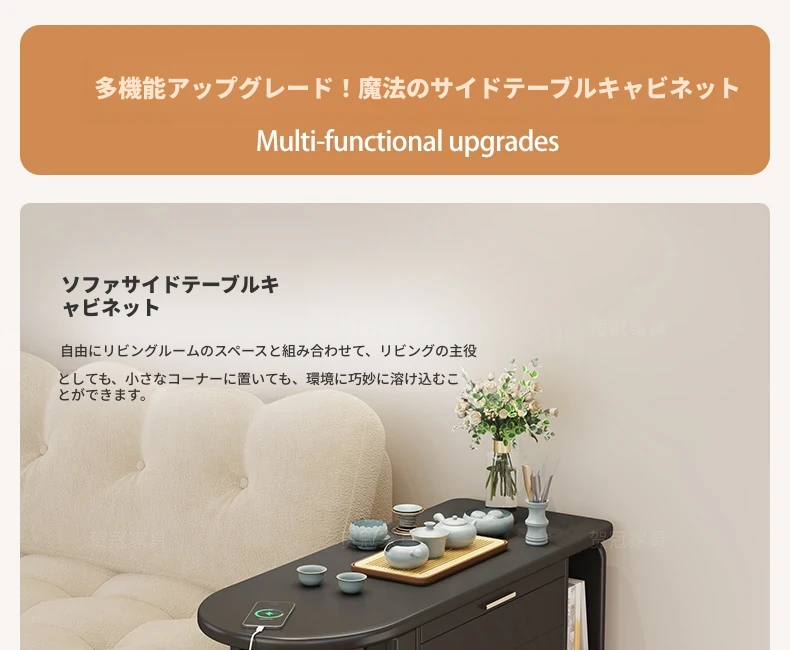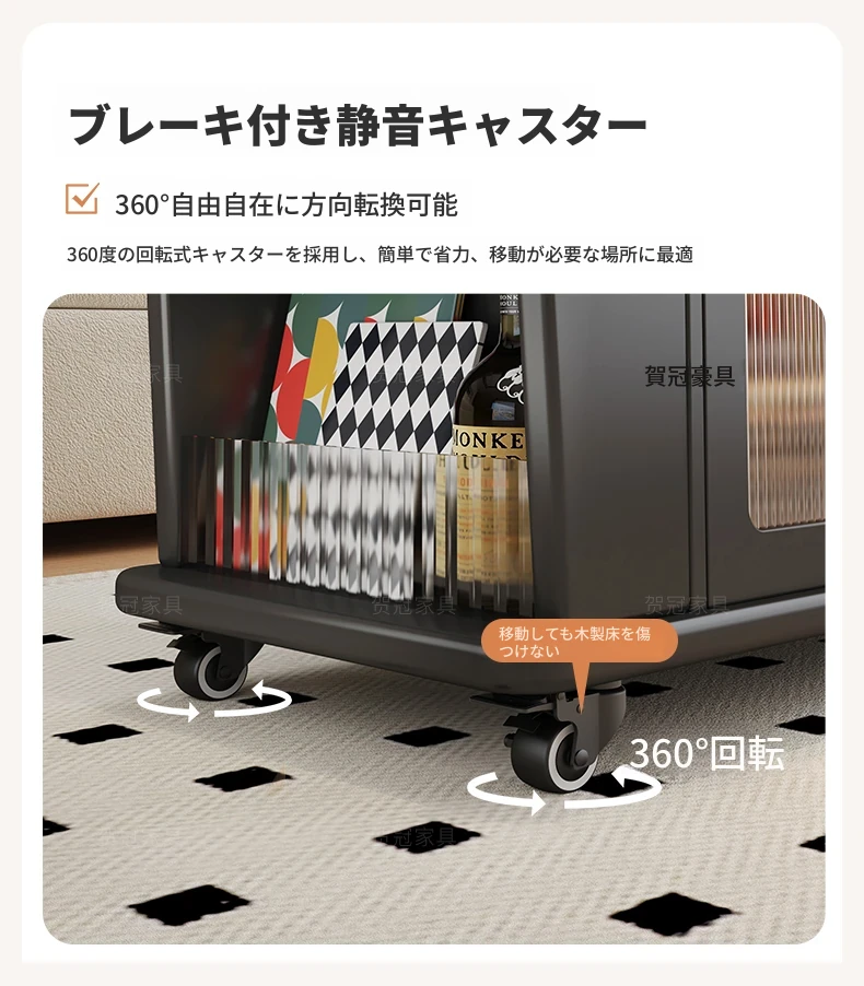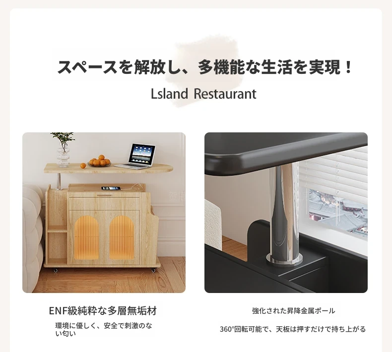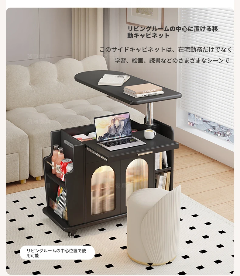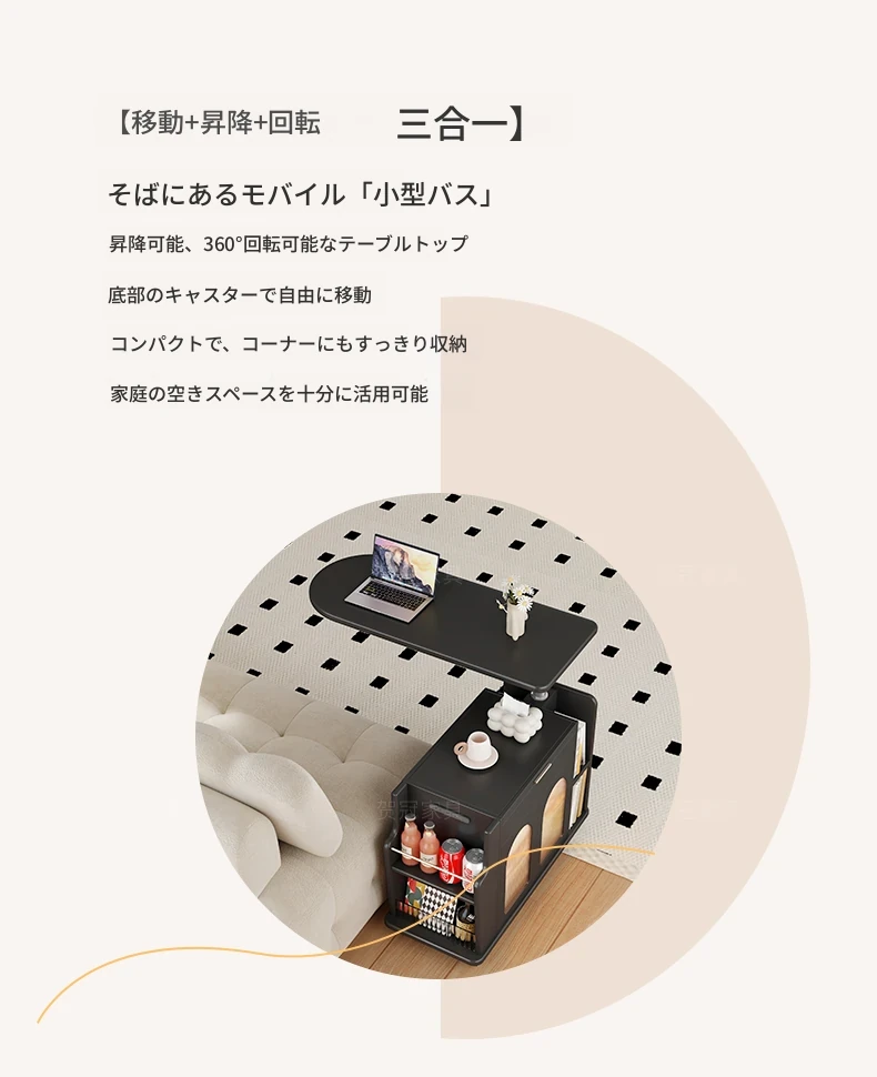 イタリア風シンプルデザイン!可動式昇降ベッドサイドテーブル&キャビネット一体型★小スペースの寝室に最適、回転式のナイトスタンド兼コンパクトなワゴン♪