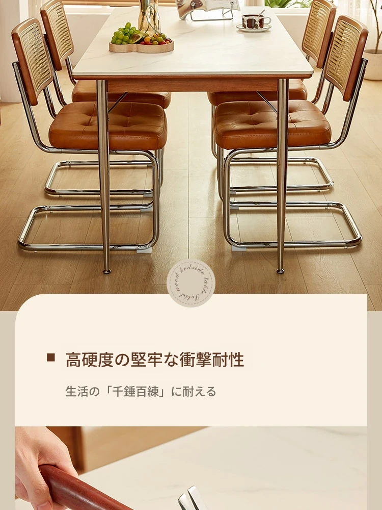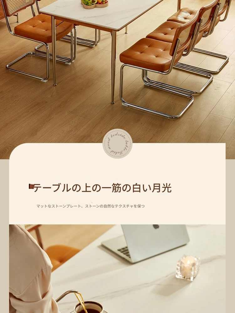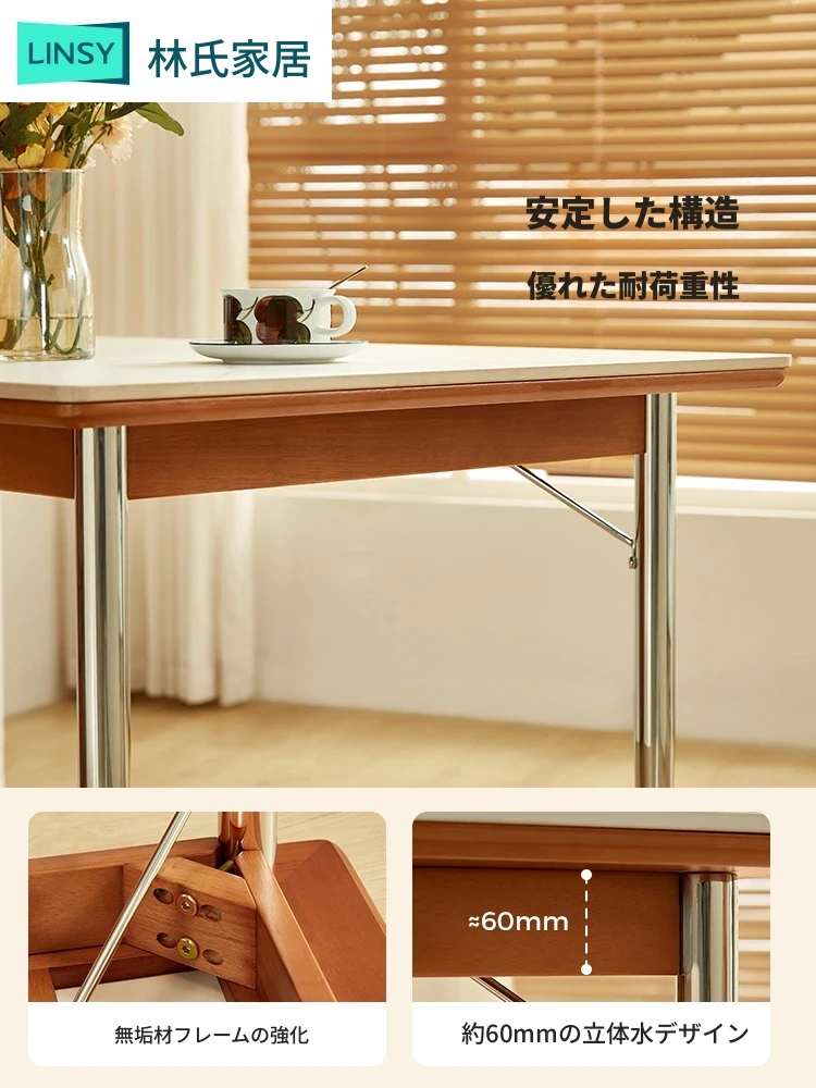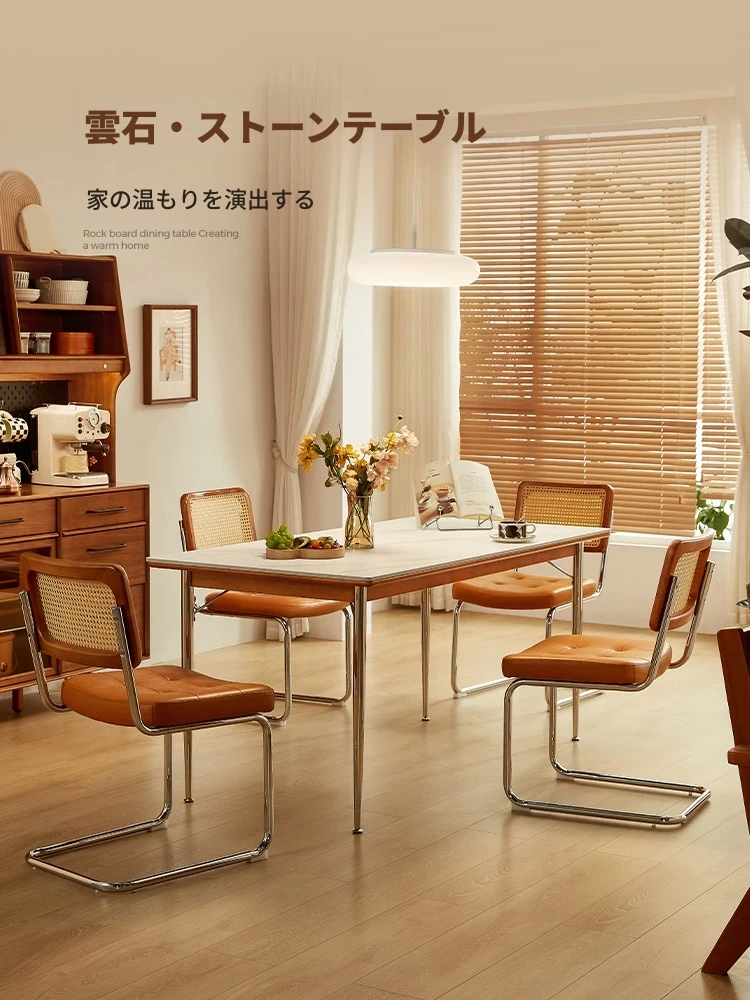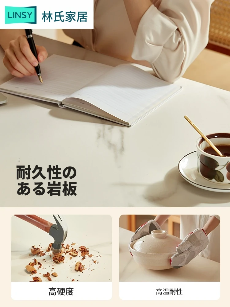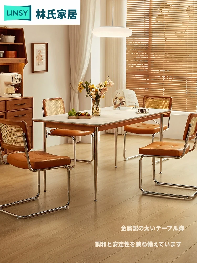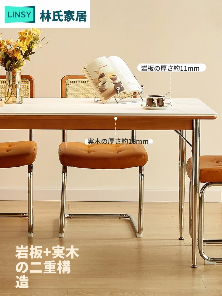 林氏家居のレトロな無垢材ダイニングテーブル兼デスク - スタイリッシュなスクエア岩板天板で、食事と仕事を快適に!高品質な座席付き、あなたのライフスタイルを格上げ!