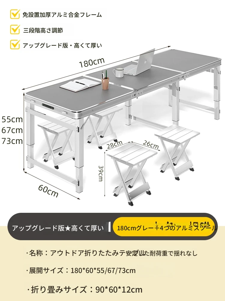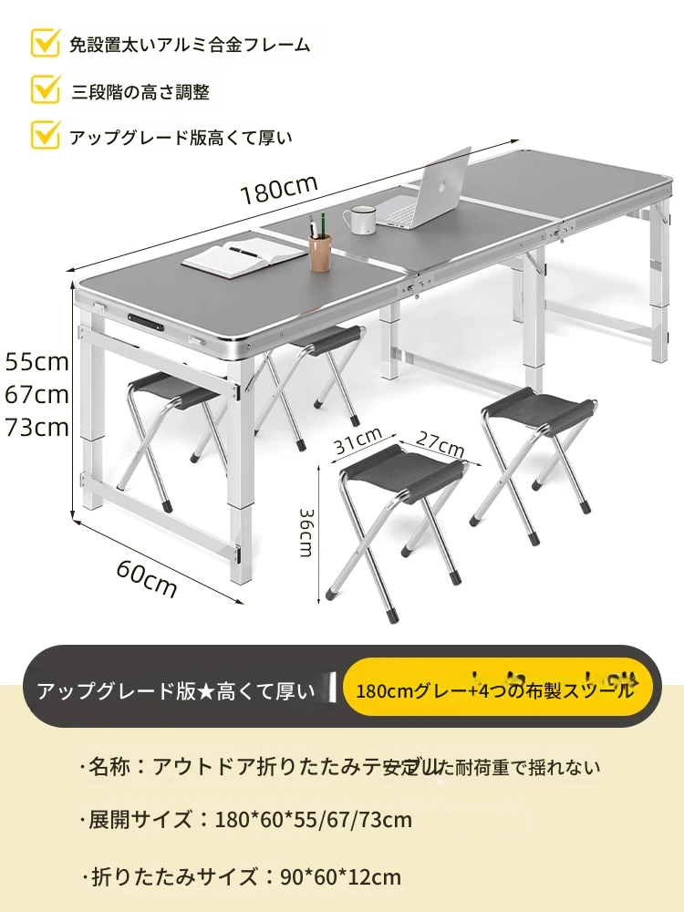 【アップグレード版★高さアップ・厚さアップ】180cmグレー+4アルミスツール