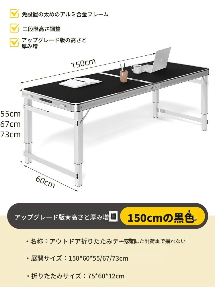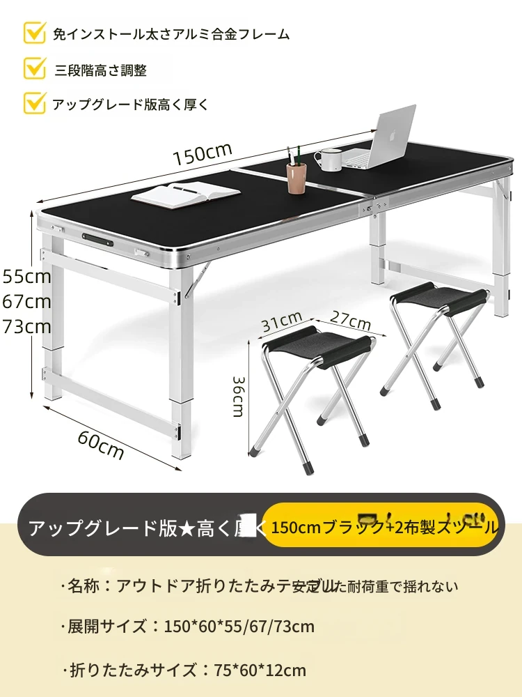 【アップグレード版★高さアップ・厚さアップ】150cmブラック+2アルミスツール
