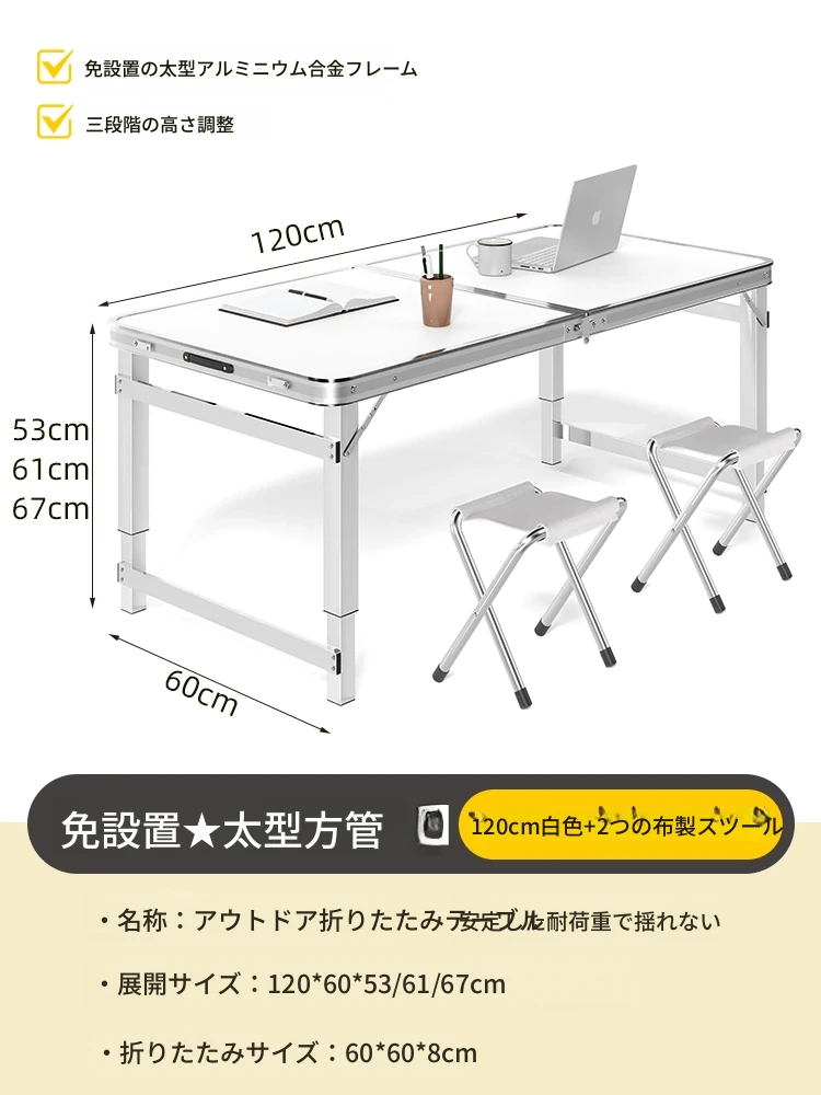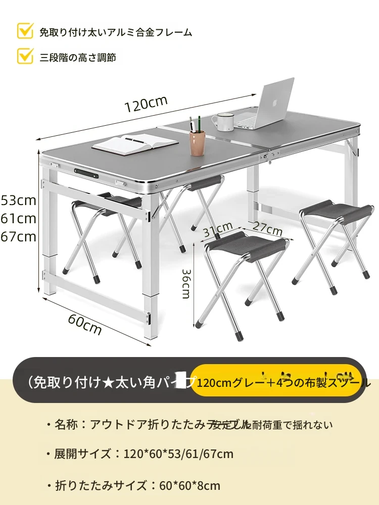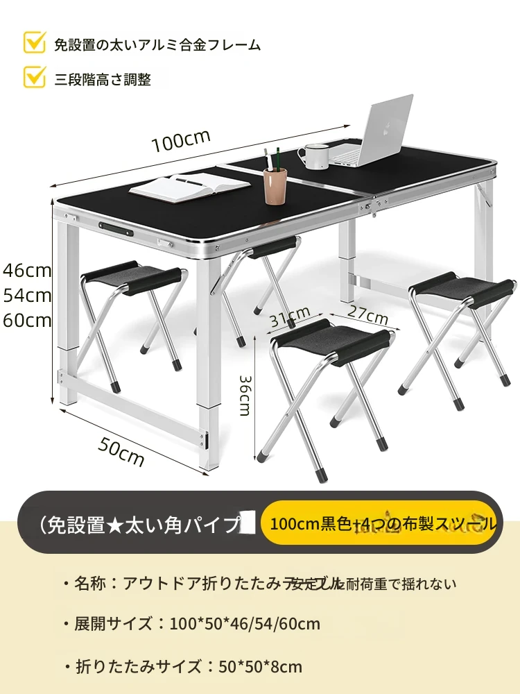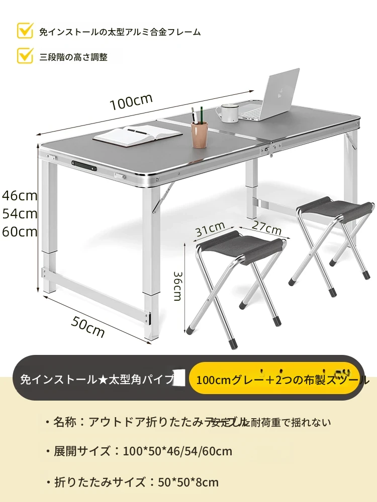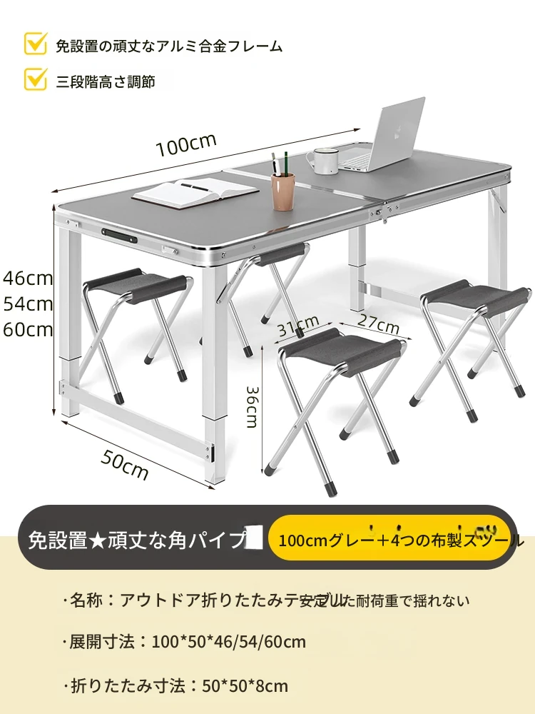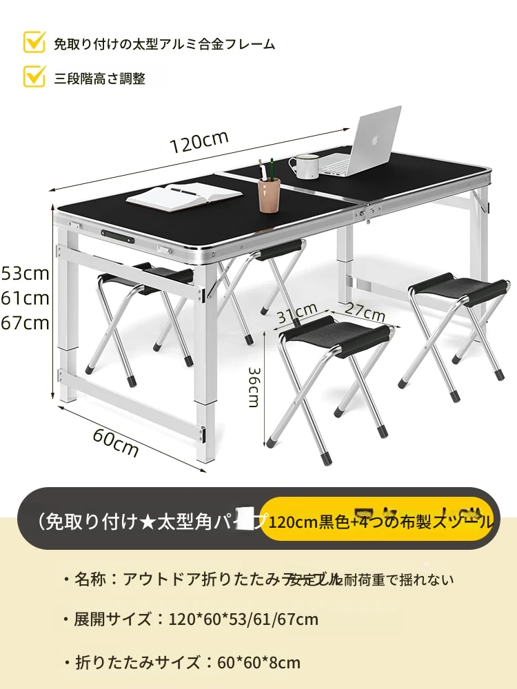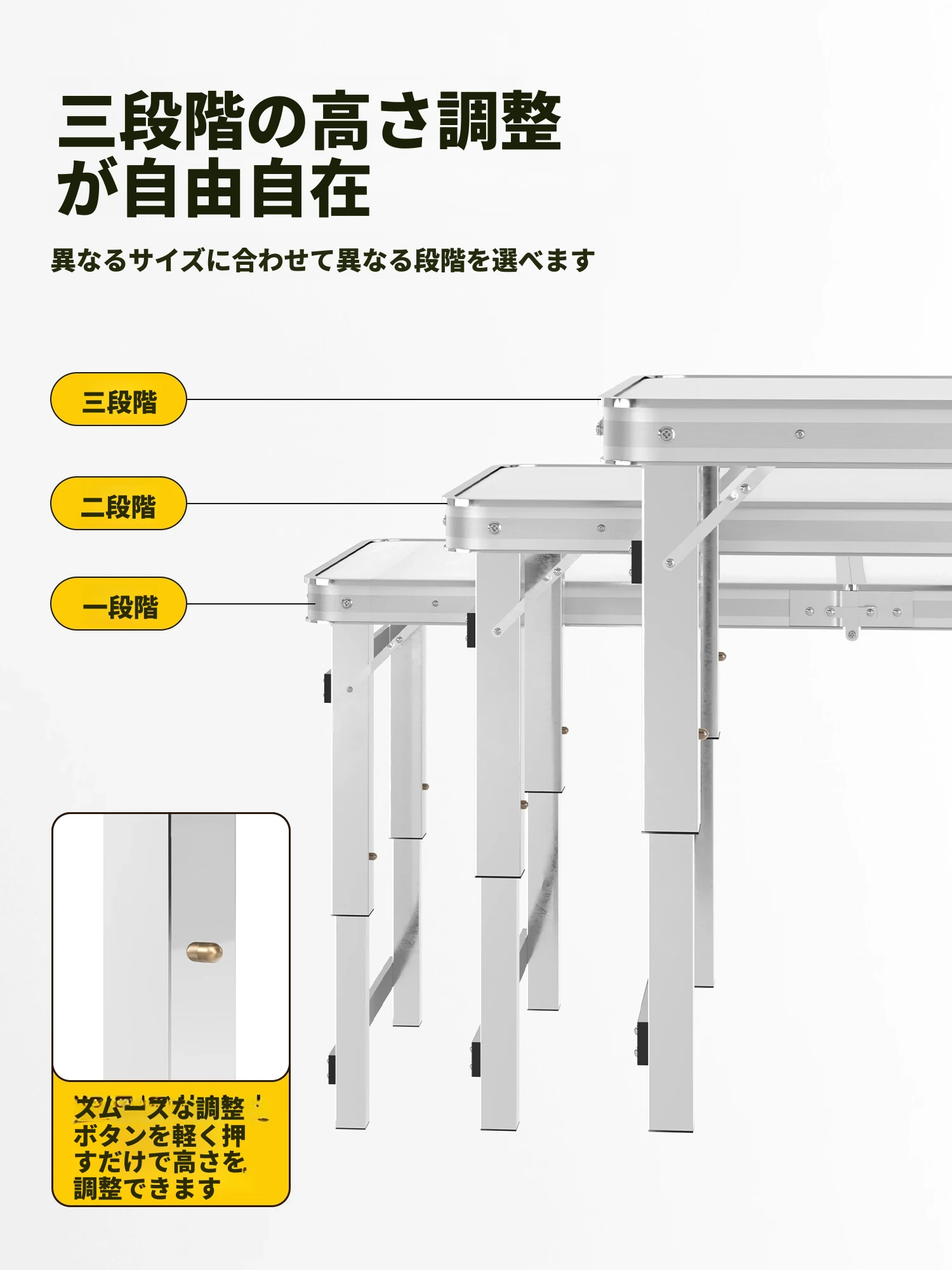 折りたたみ式ポータブルアウトドアテーブル - 高さ調整可能なアルミ合金製キャンプ&ピクニックテーブル!簡単に持ち運べる夜市や屋外イベントに最適!使い勝手抜群の小型テーブルチェアセット。