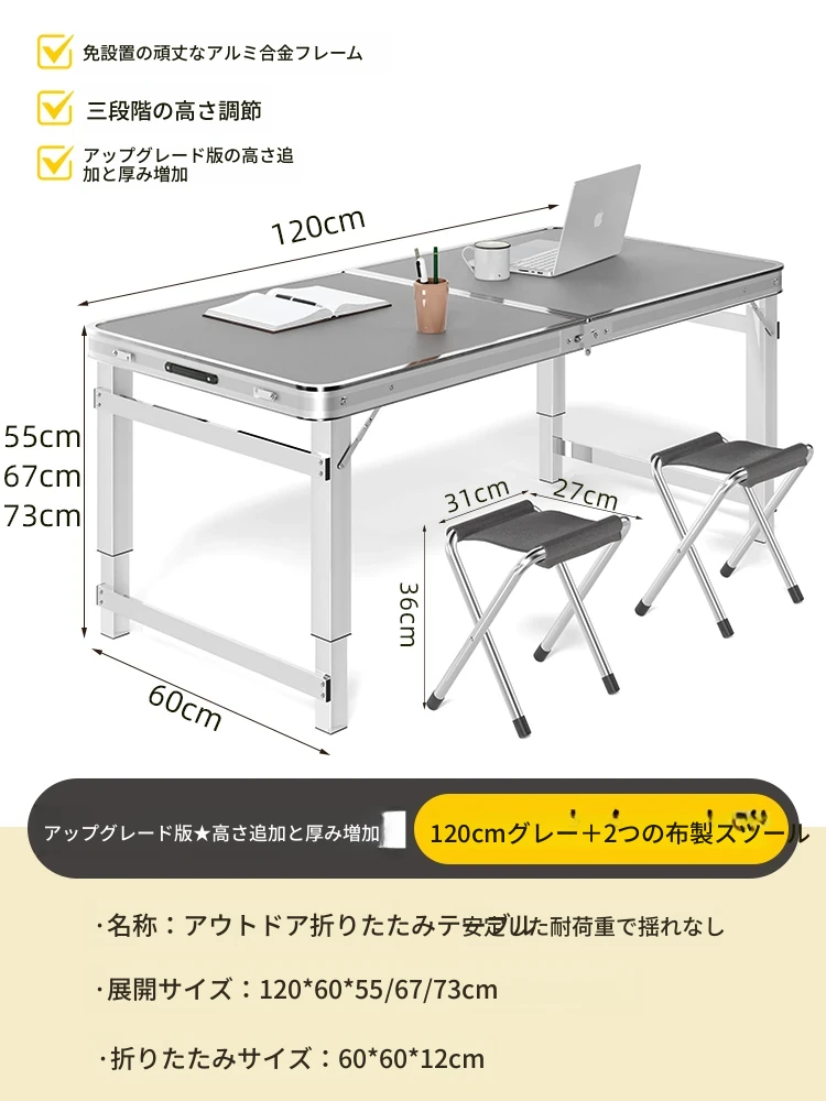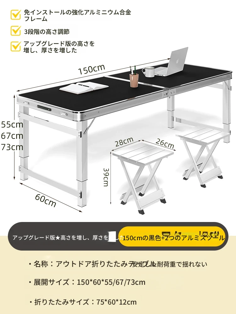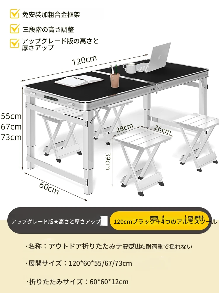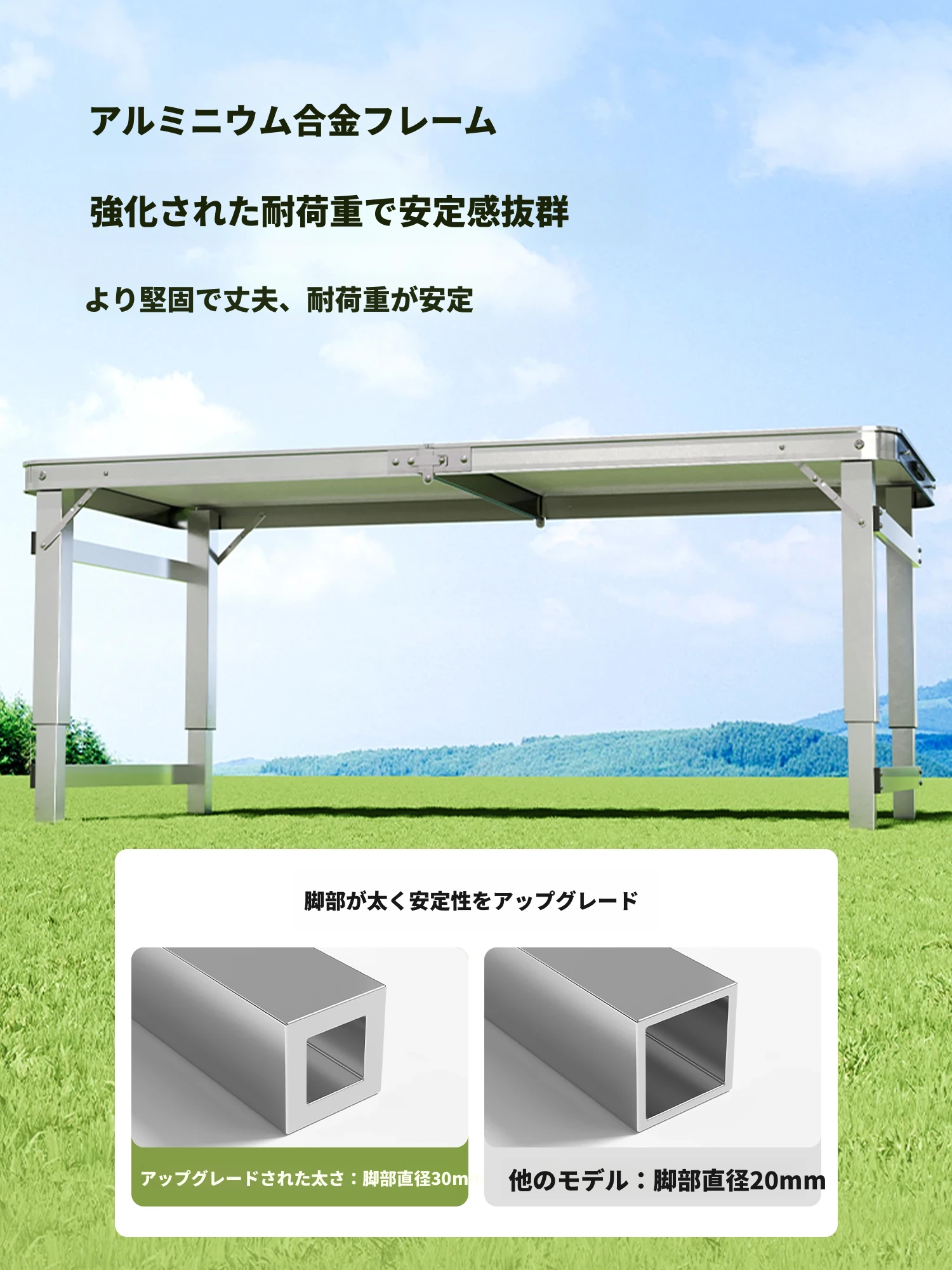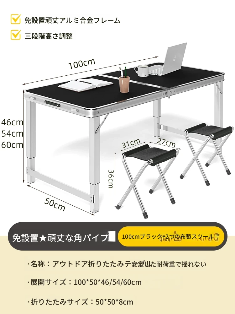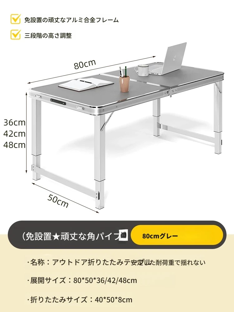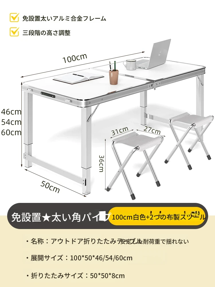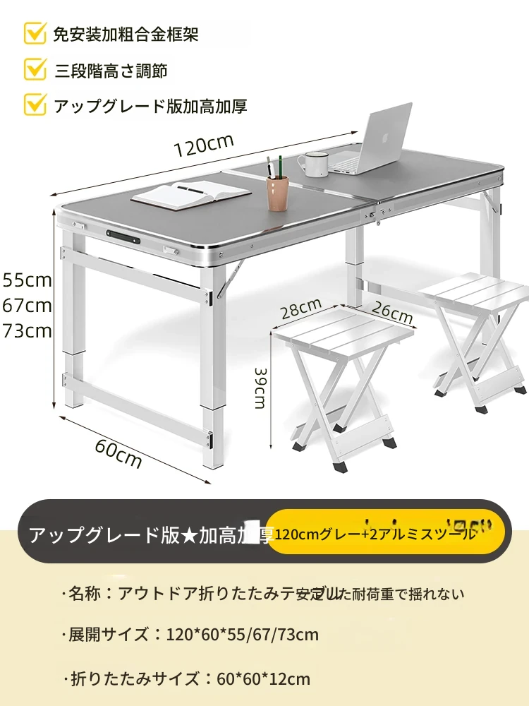 折りたたみ式ポータブルアウトドアテーブル - 高さ調整可能なアルミ合金製キャンプ&ピクニックテーブル!簡単に持ち運べる夜市や屋外イベントに最適!使い勝手抜群の小型テーブルチェアセット。