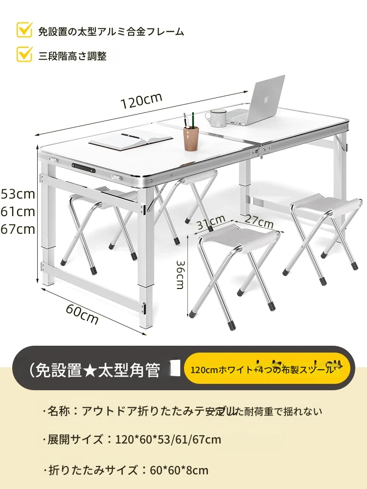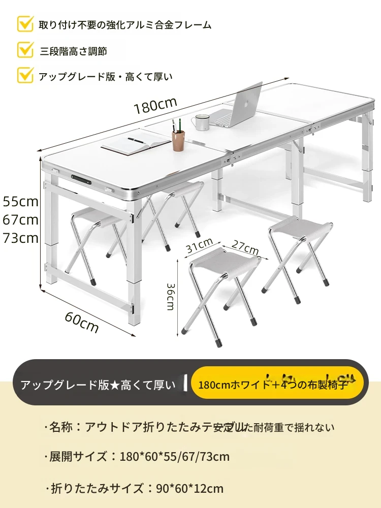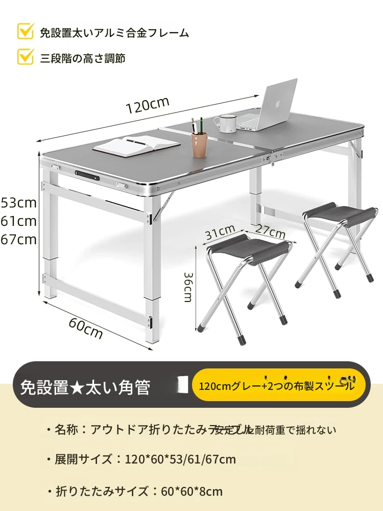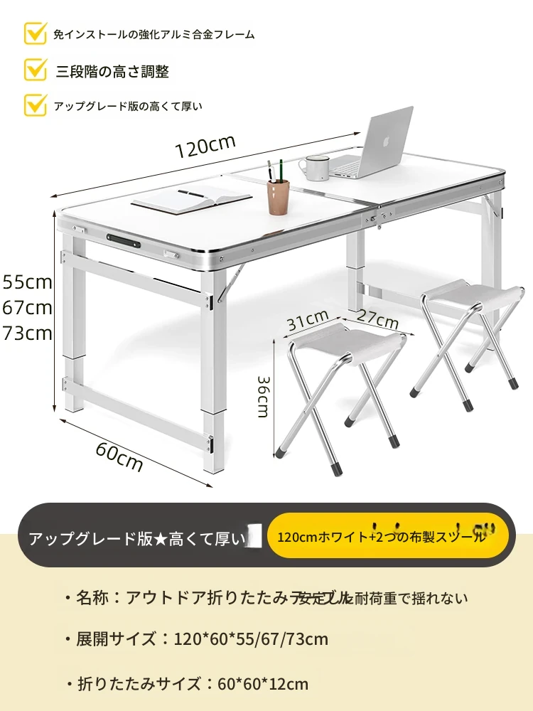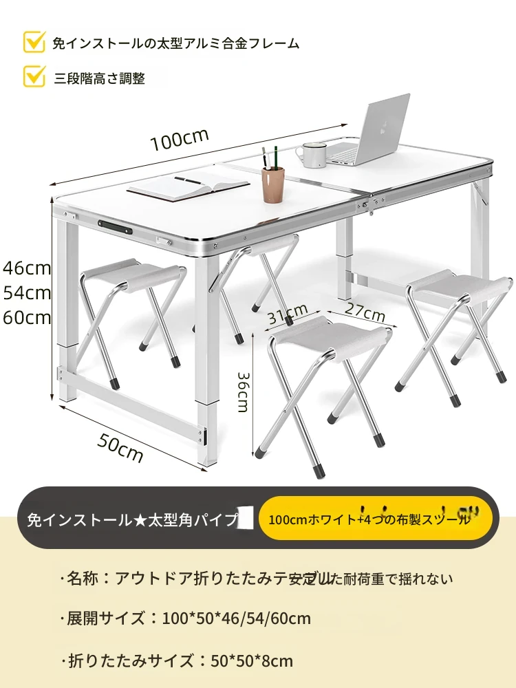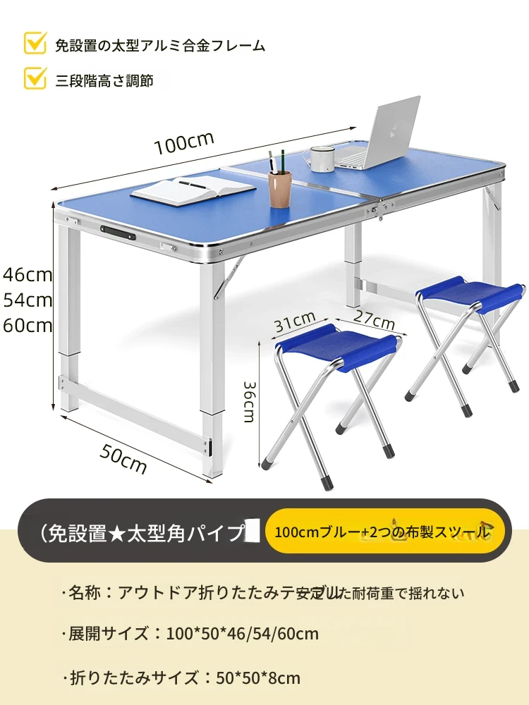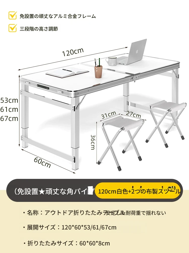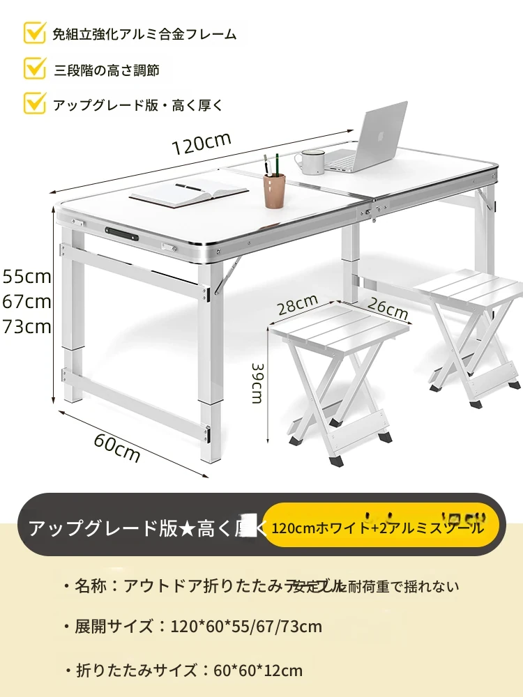 折りたたみ式ポータブルアウトドアテーブル - 高さ調整可能なアルミ合金製キャンプ&ピクニックテーブル!簡単に持ち運べる夜市や屋外イベントに最適!使い勝手抜群の小型テーブルチェアセット。