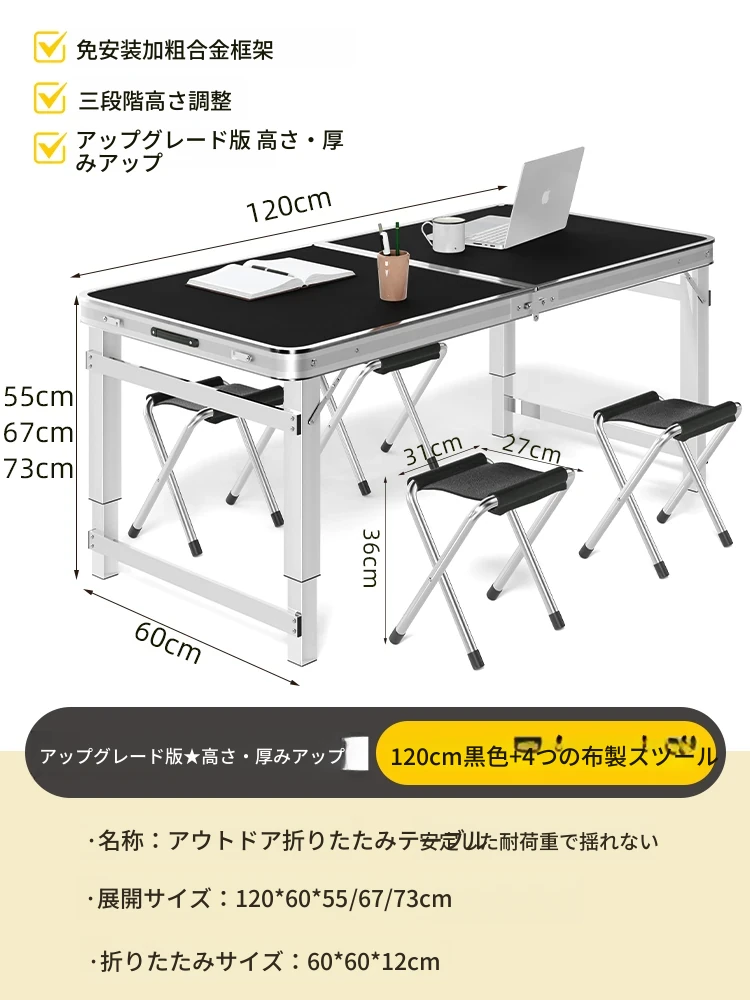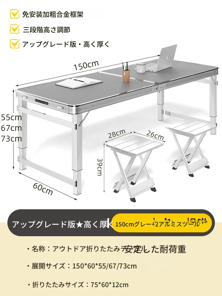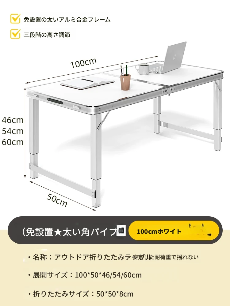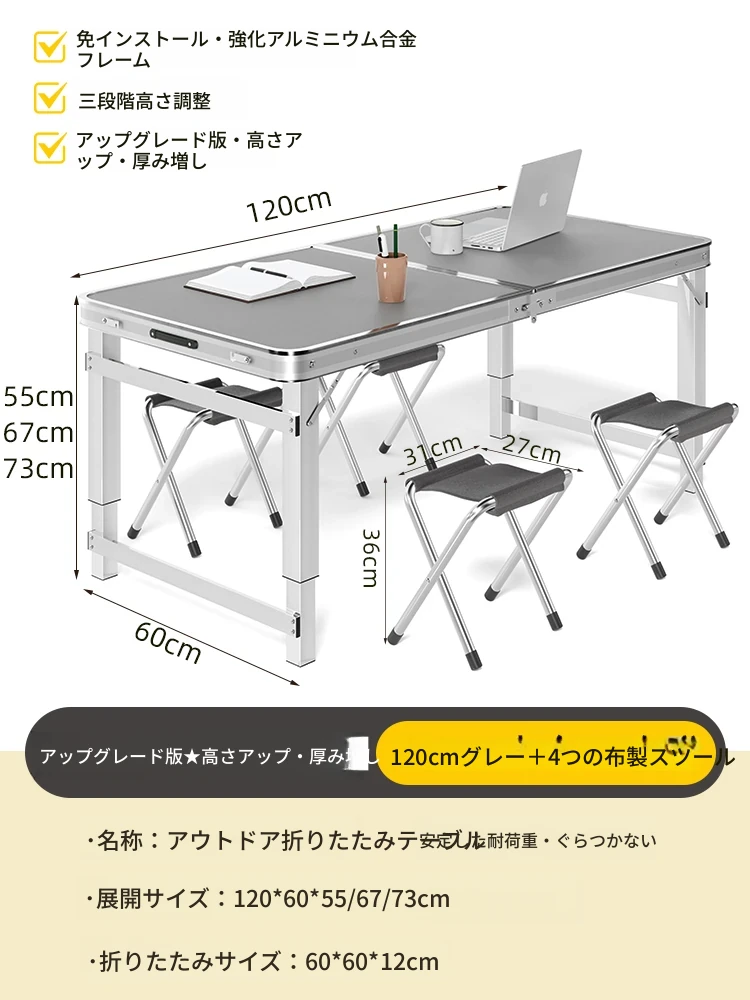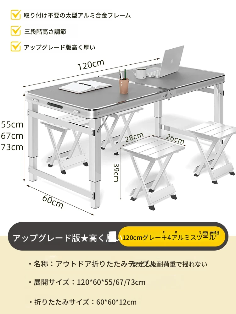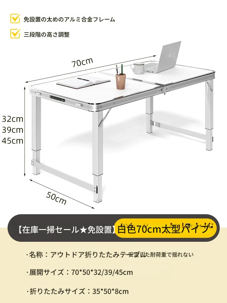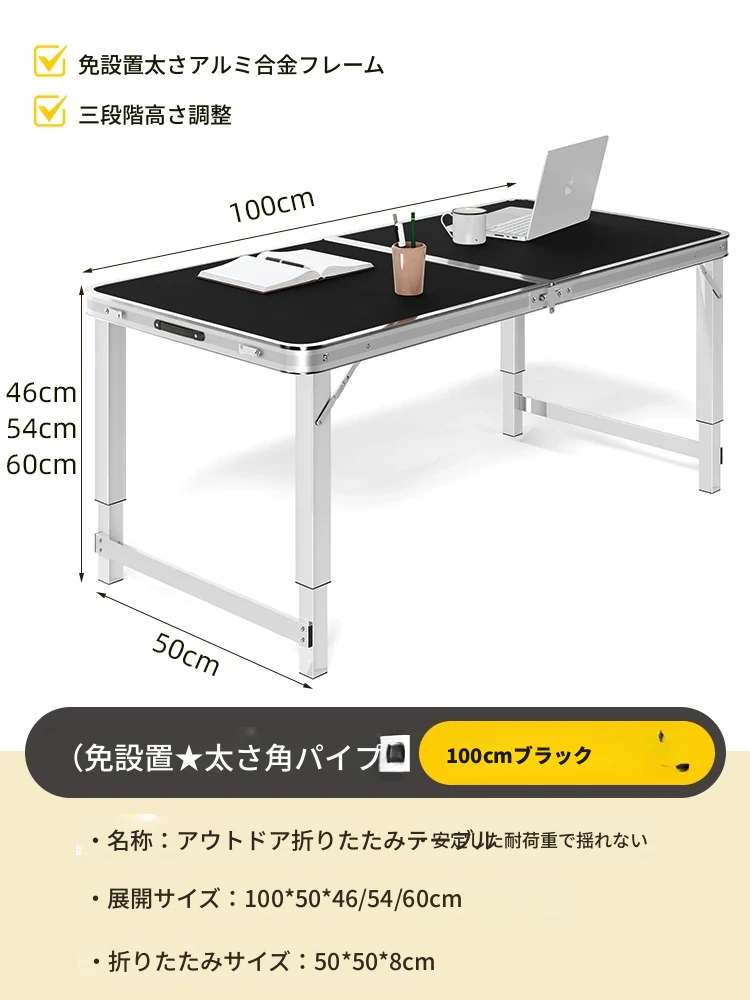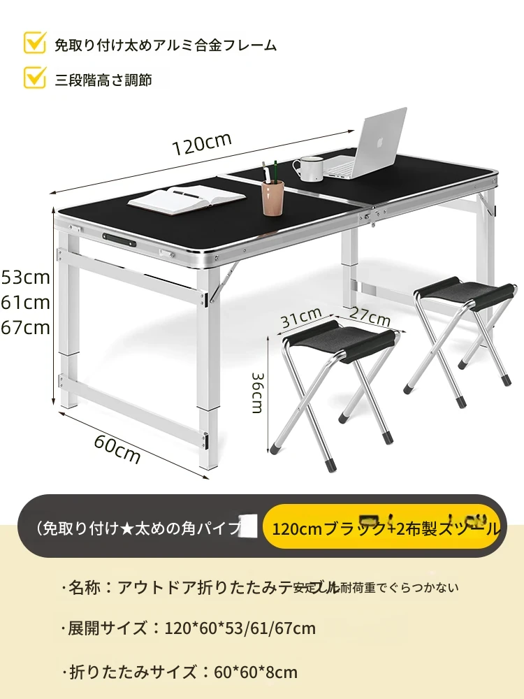 折りたたみ式ポータブルアウトドアテーブル - 高さ調整可能なアルミ合金製キャンプ&ピクニックテーブル!簡単に持ち運べる夜市や屋外イベントに最適!使い勝手抜群の小型テーブルチェアセット。