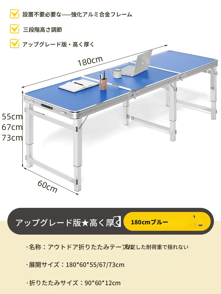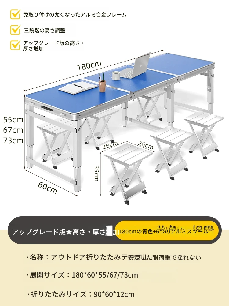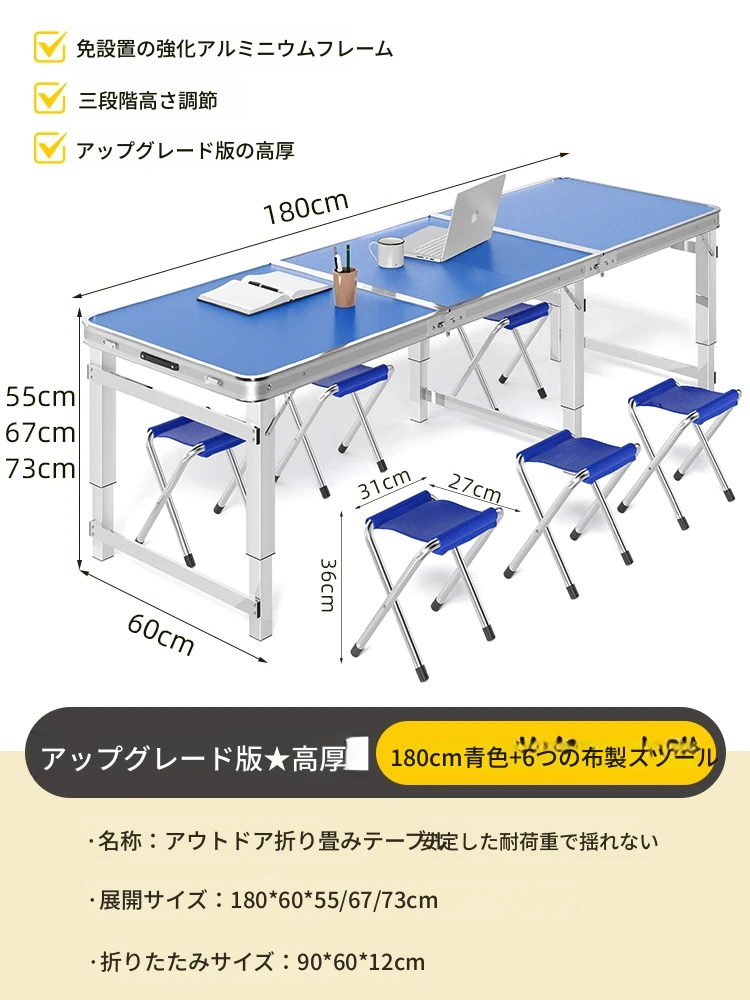 【アップグレード版★高さアップ・厚さアップ】180cmブルー+6アルミスツール