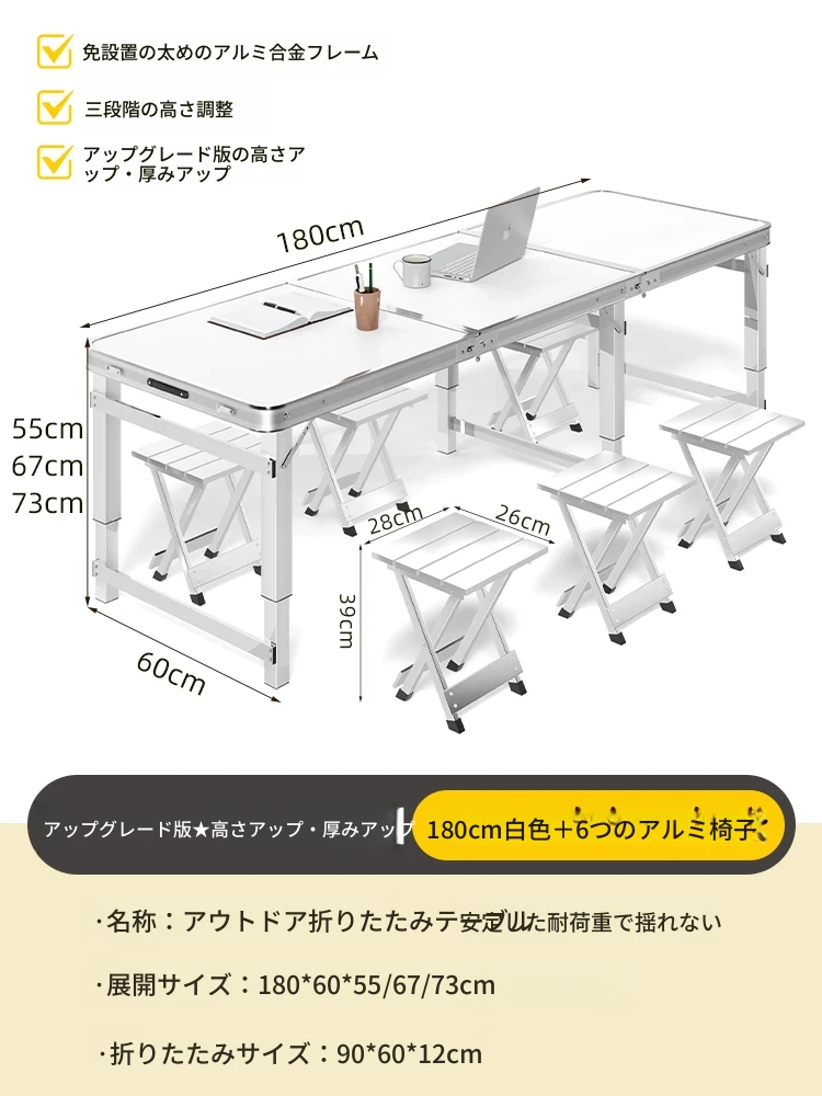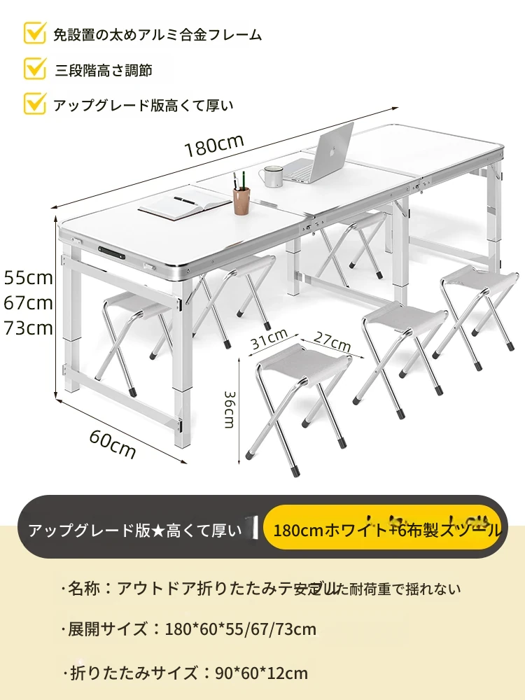 【アップグレード版★高さアップ・厚さアップ】180cmホワイト+6アルミスツール