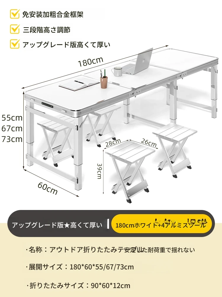【アップグレード版★高さアップ・厚さアップ】180cmホワイト+4アルミスツール
