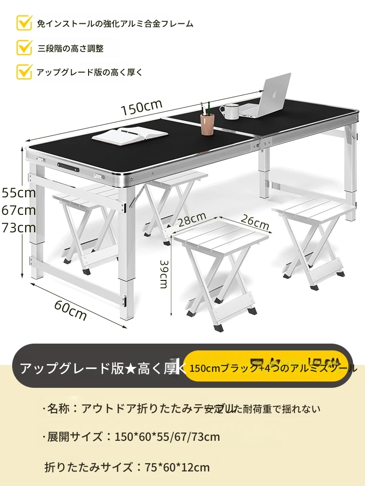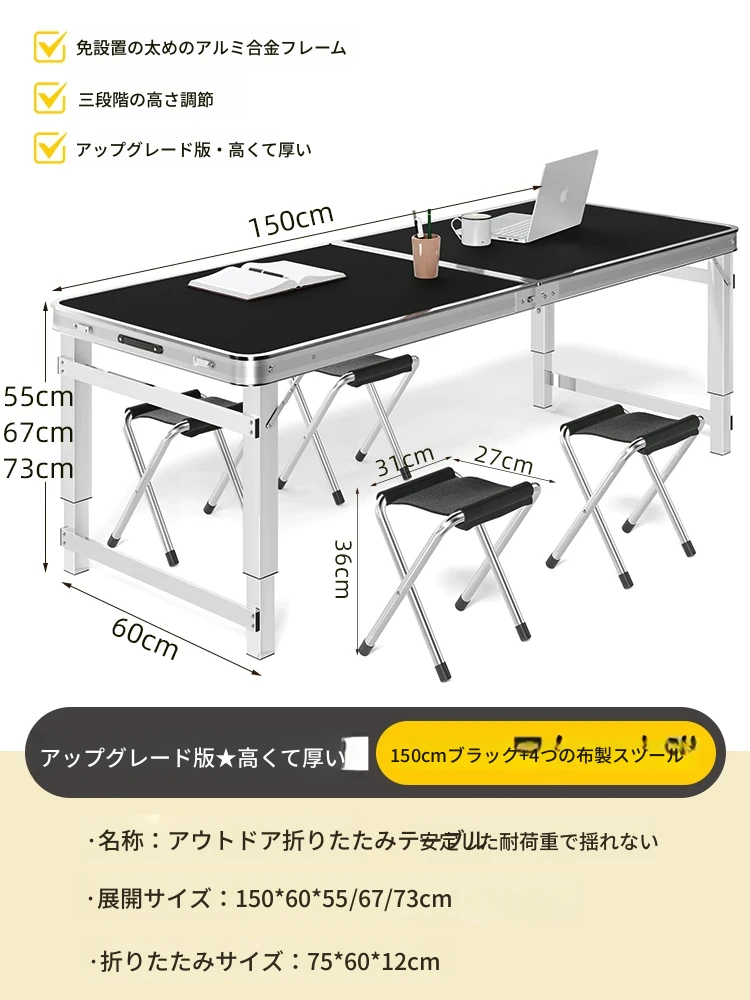 【アップグレード版★高さアップ・厚さアップ】150cmブラック+4アルミスツール