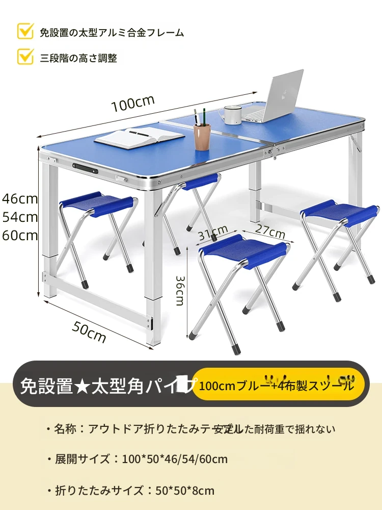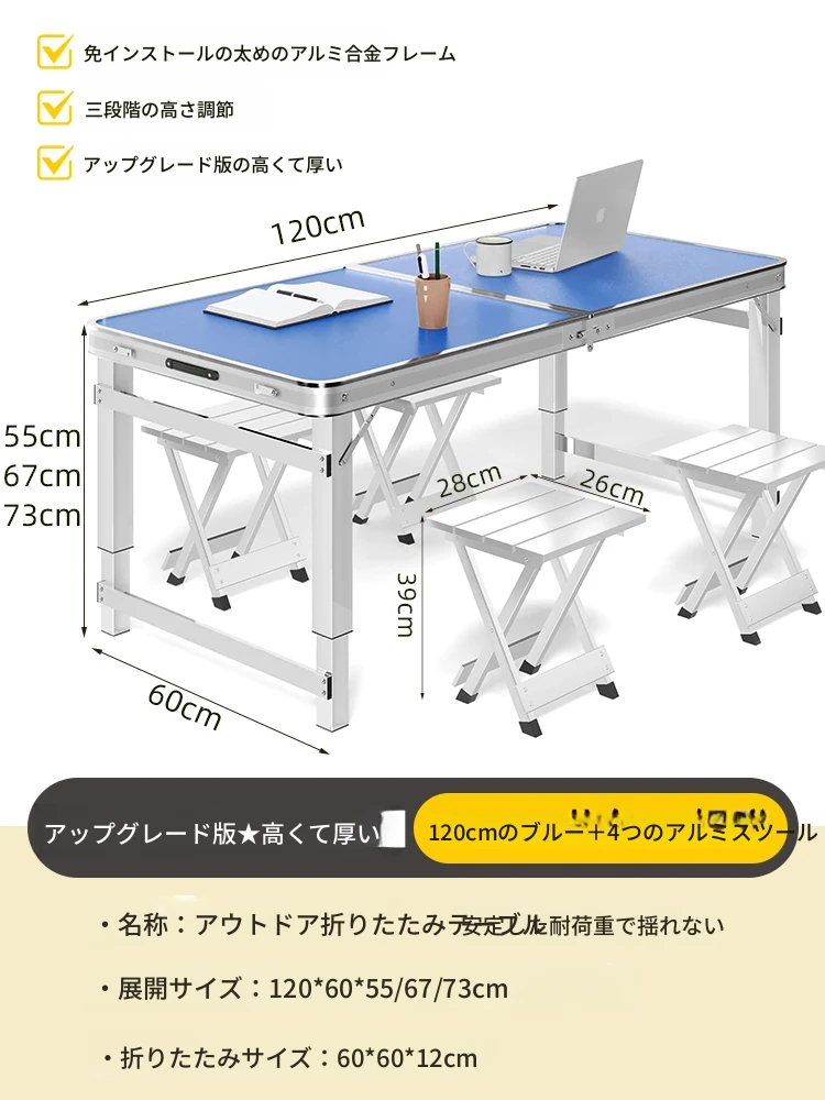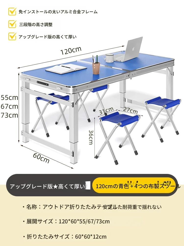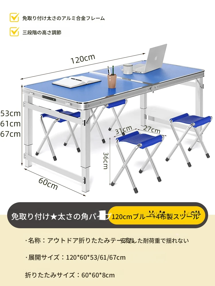【アップグレード版★高さアップ・厚さアップ】120cmブルー+4アルミスツール