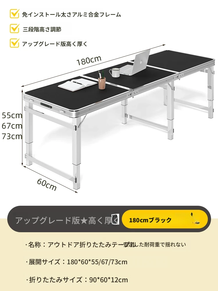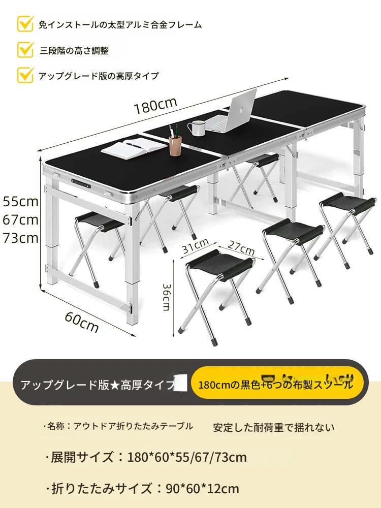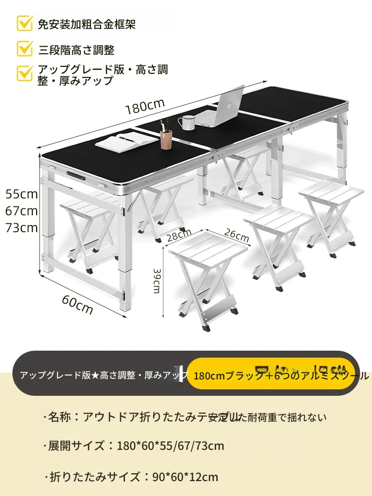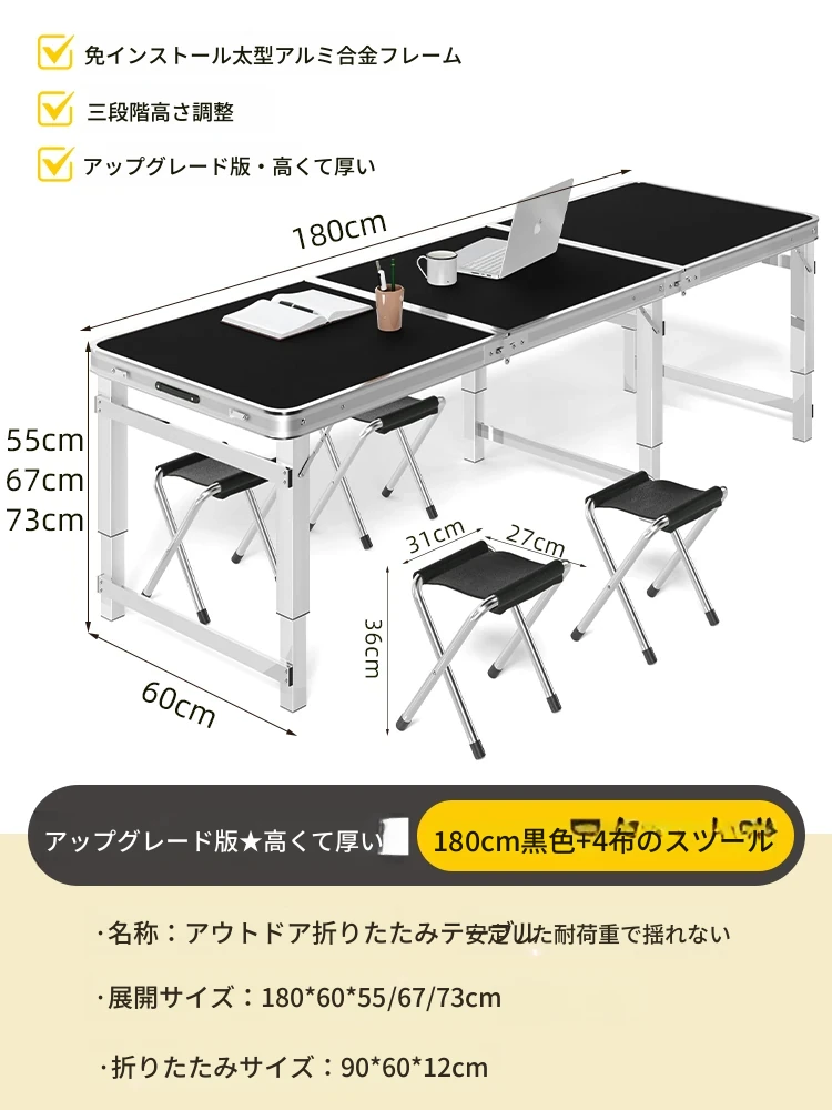 【アップグレード版★高さアップ・厚さアップ】180cmブラック+6アルミスツール
