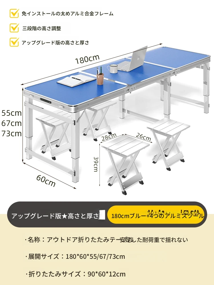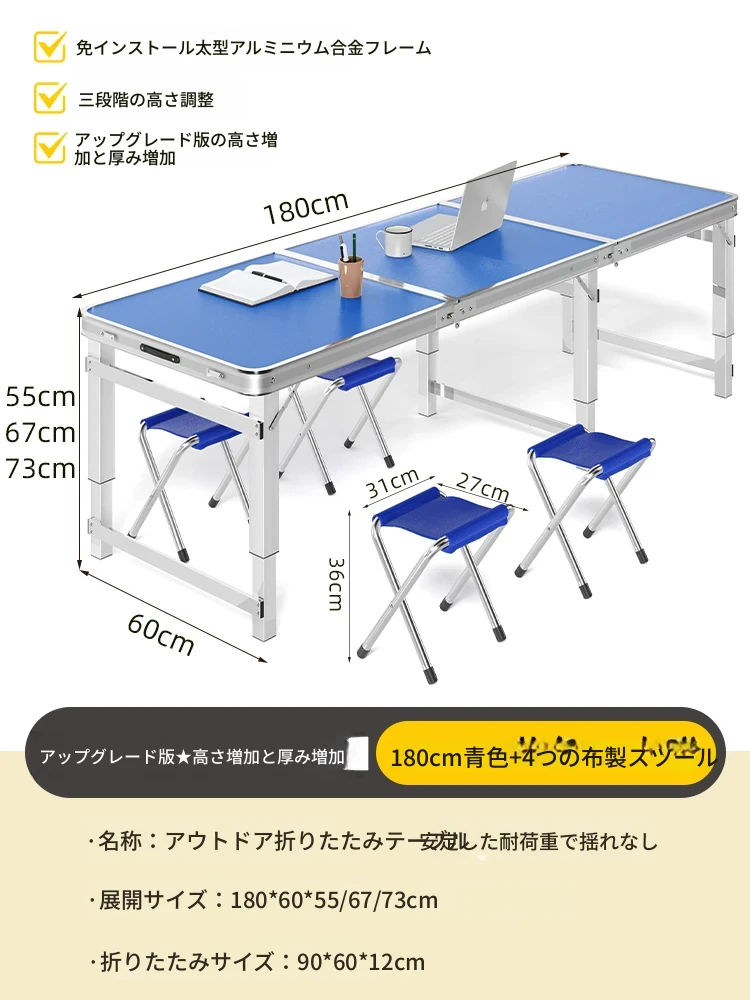 【アップグレード版★高さアップ・厚さアップ】180cmブルー+4アルミスツール