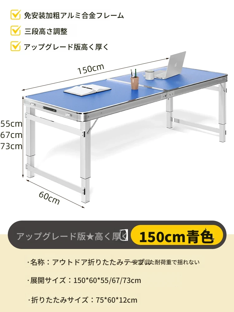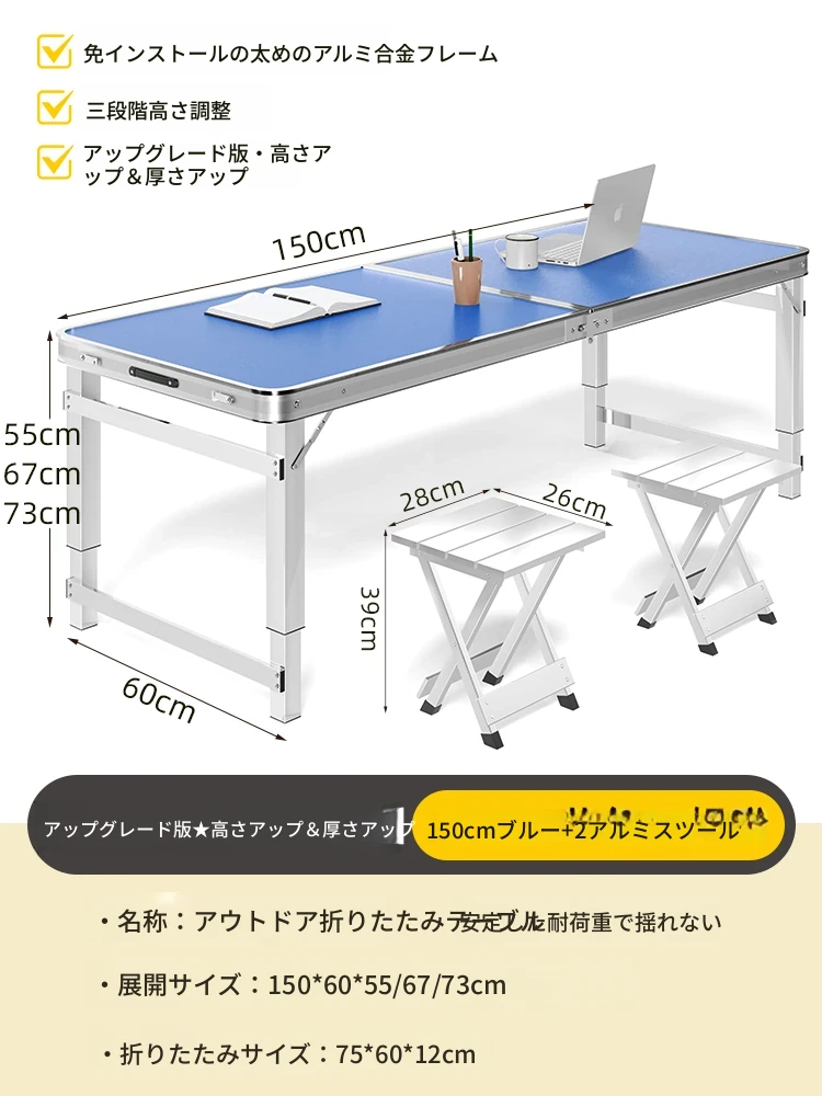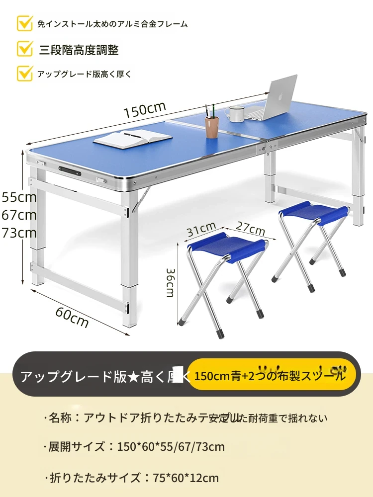 【アップグレード版★高さアップ・厚さアップ】150cmブルー+2アルミスツール