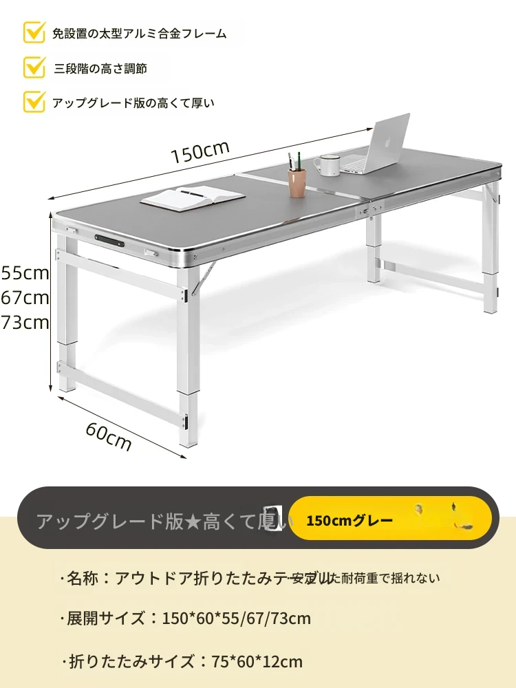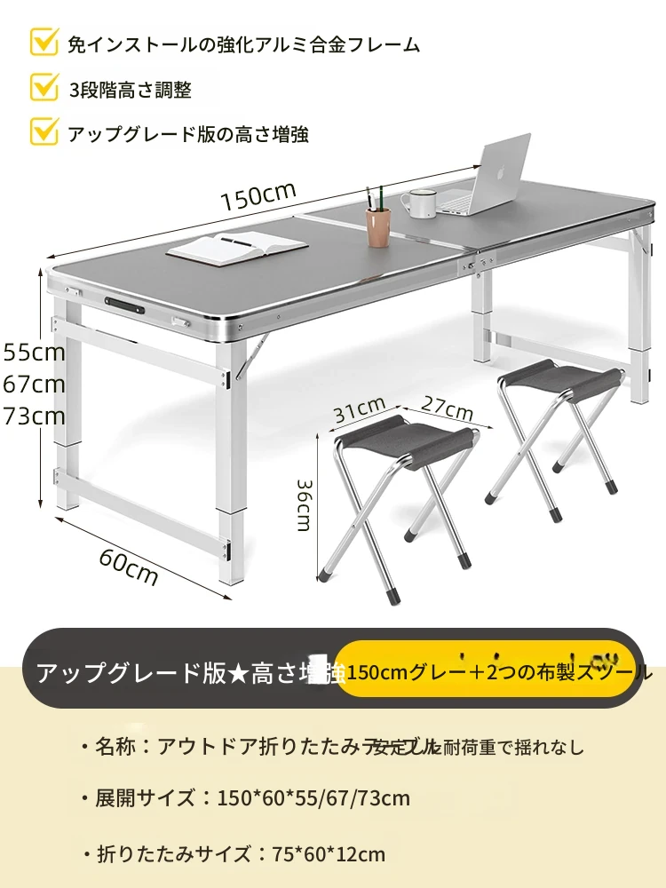 【アップグレード版★高さアップ・厚さアップ】150cmグレー+2アルミスツール